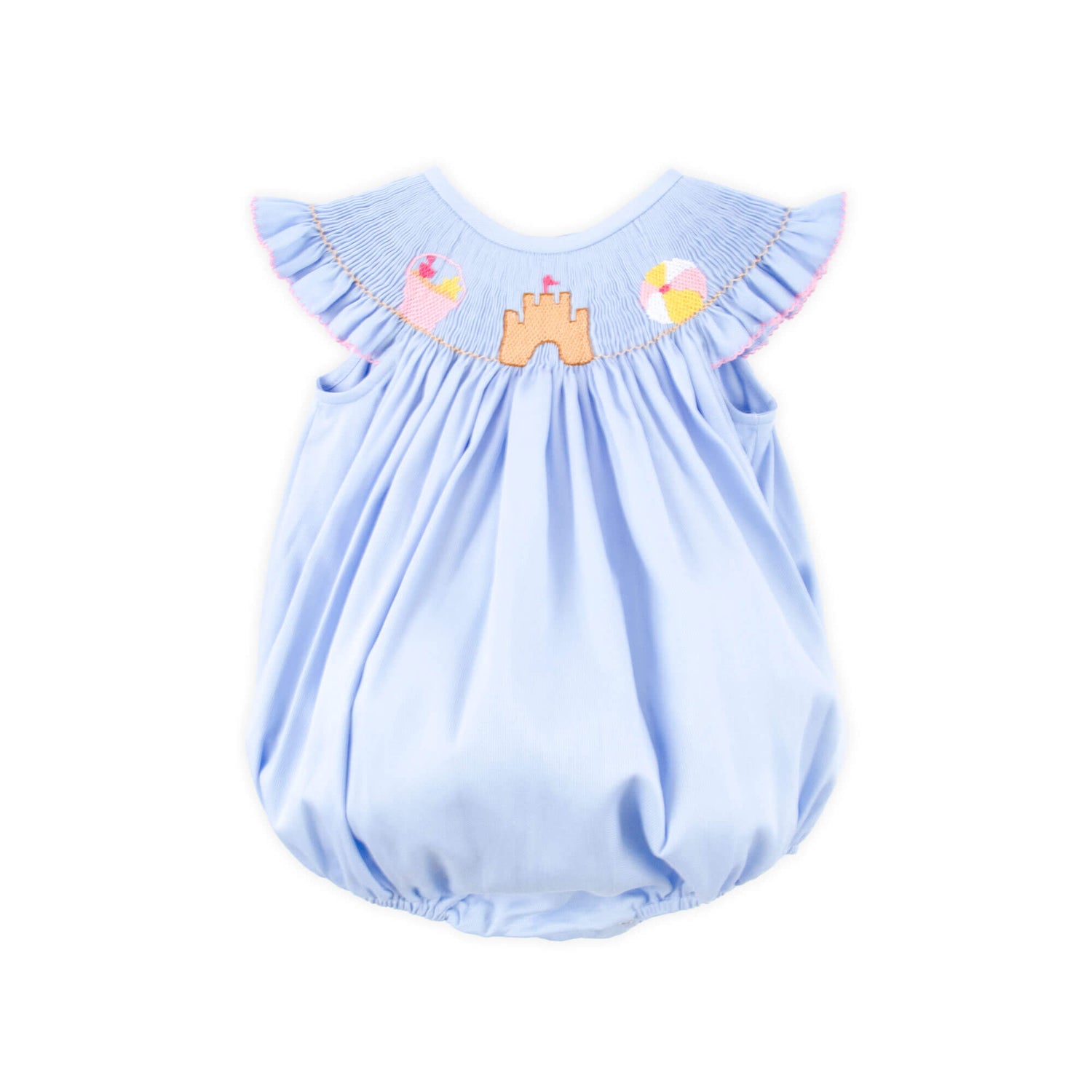Let's build a sand castle! The Beach Baby Light Blue Smocked Angel Sleeve Bubble is the ideal outfit for your upcoming beach vacation. This delightful light blue bubble features a smocked sandcastle scene and angel-style sleeves, accented with a pink picot trim. It conveniently fastens with snaps in the stride.