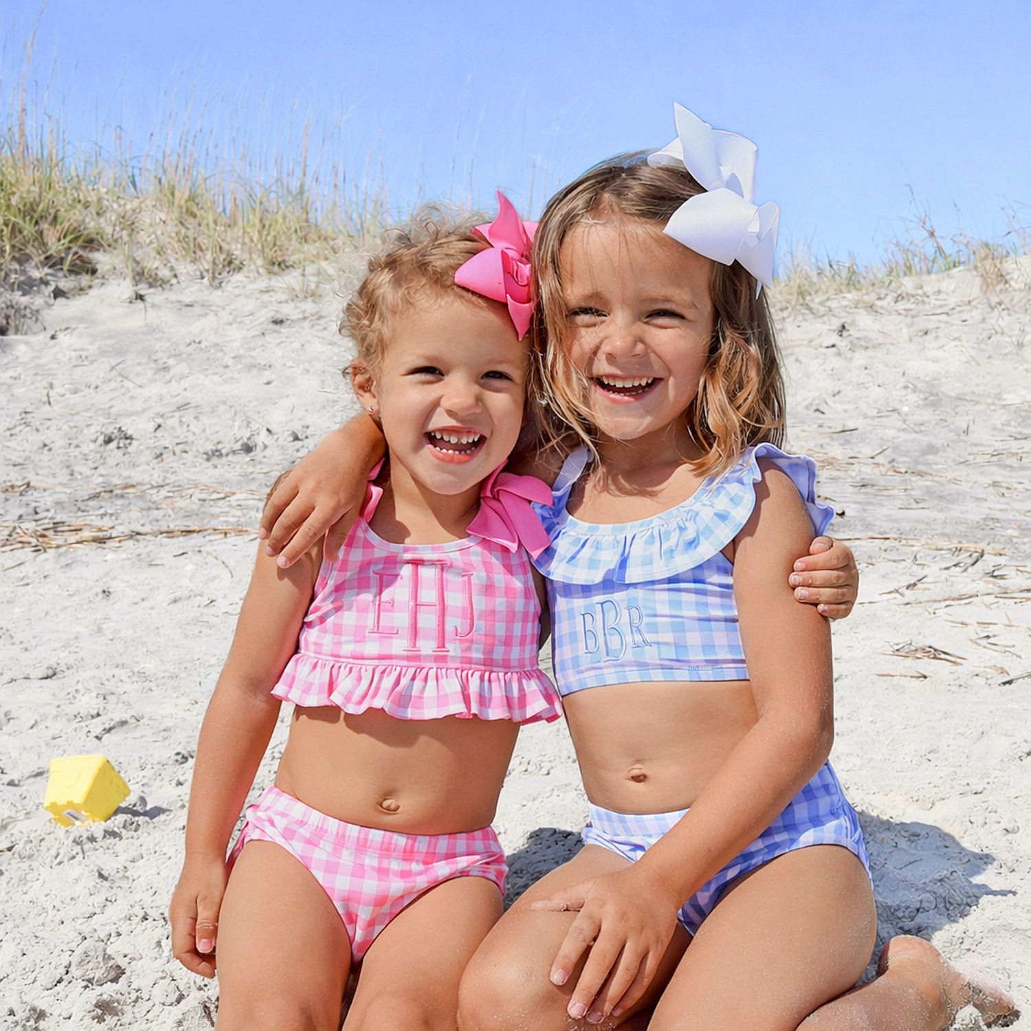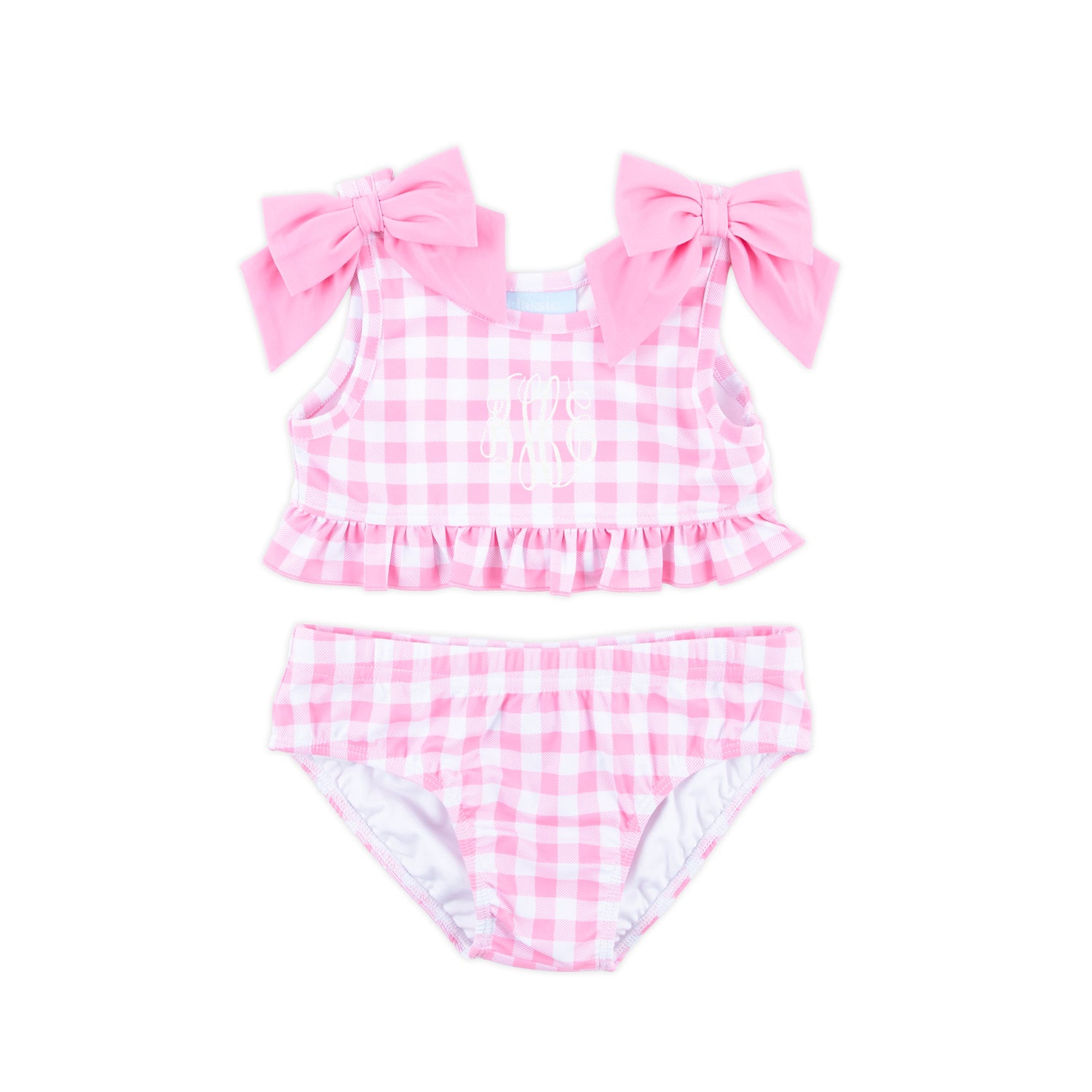 This Capri Pink Two Piece Swimsuit is the perfect choice for your upcoming family vacation or poolside gathering. The crop swim top features a fabulous pink gingham print, ruffle hem, and two adorable pink bows. Accompanied by a matching pink gingham swim bottom, this set ensures both style and comfort. The swimsuit provides UPF 50 Protection to keep your little one safe under the sun. Personalize the look by adding a monogram to make it uniquely yours!
