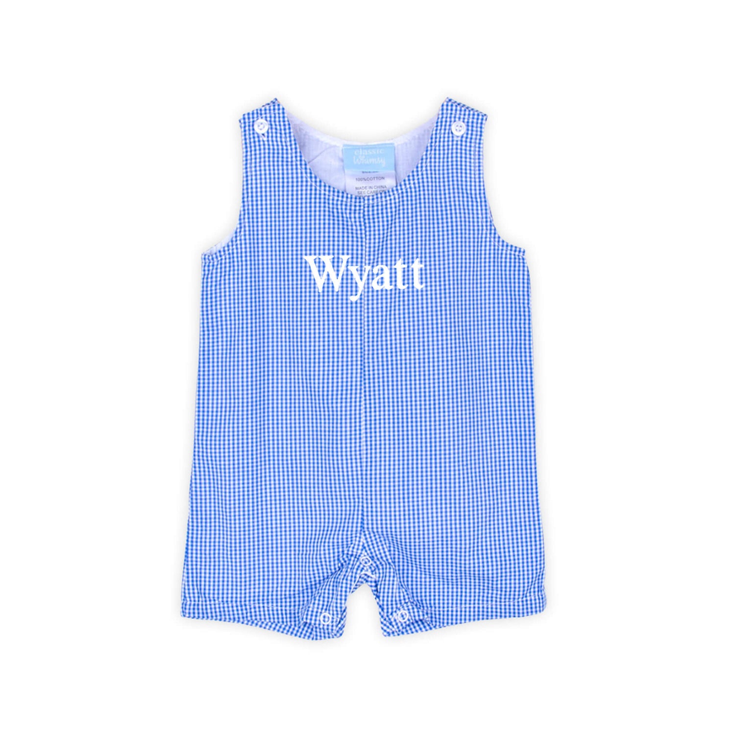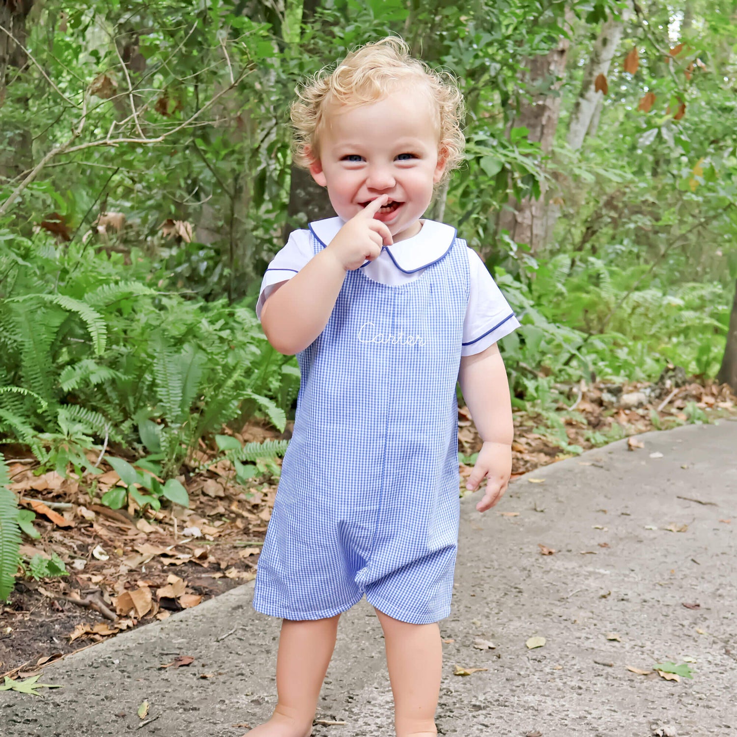 Elevate your little one's wardrobe with our Royal Blue Gingham Jon Jon, the perfect addition for the season. This jon jon is both stylish and versatile. It features convenient shoulder buttons and snaps in stride for easy changes. Ideal for outings to the pumpkin patch, Thanksgiving gatherings, Christmas, Easter celebrations, or any special occasion, this outfit is sure to make your little one stand out. Personalize it with a monogram to make it even more special and unique!