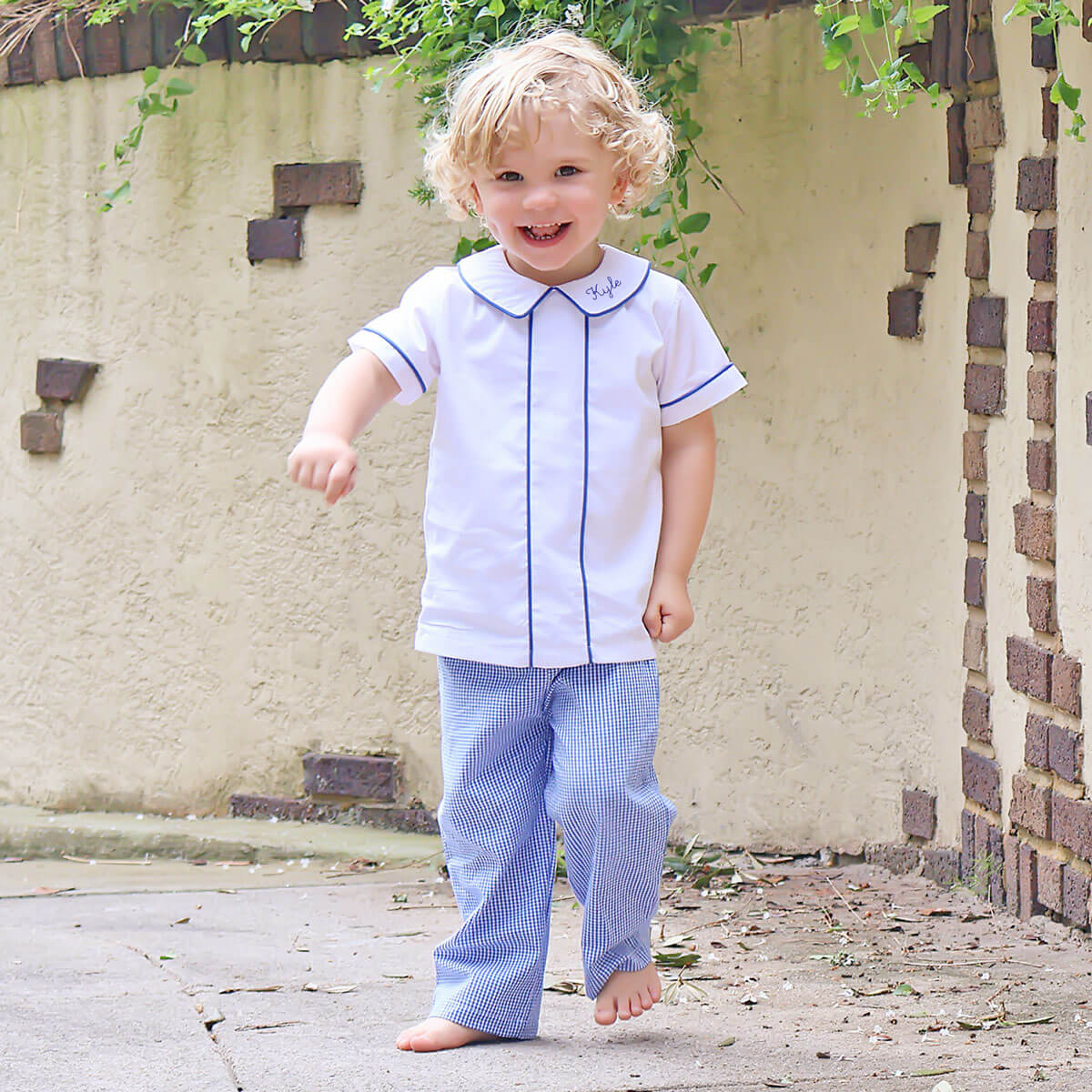This Royal Blue Gingham Standard Pants are a classic addition to your big boy's wardrobe for year-round wear. Versatile and stylish, they can be paired with your favorite button-down or polo shirt for a timeless look. The classic straight silhouette features slant pockets, back welt pockets, a zip fly with button closure, and belt loops. These pants are perfect for school, church, play, or a collegiate look.