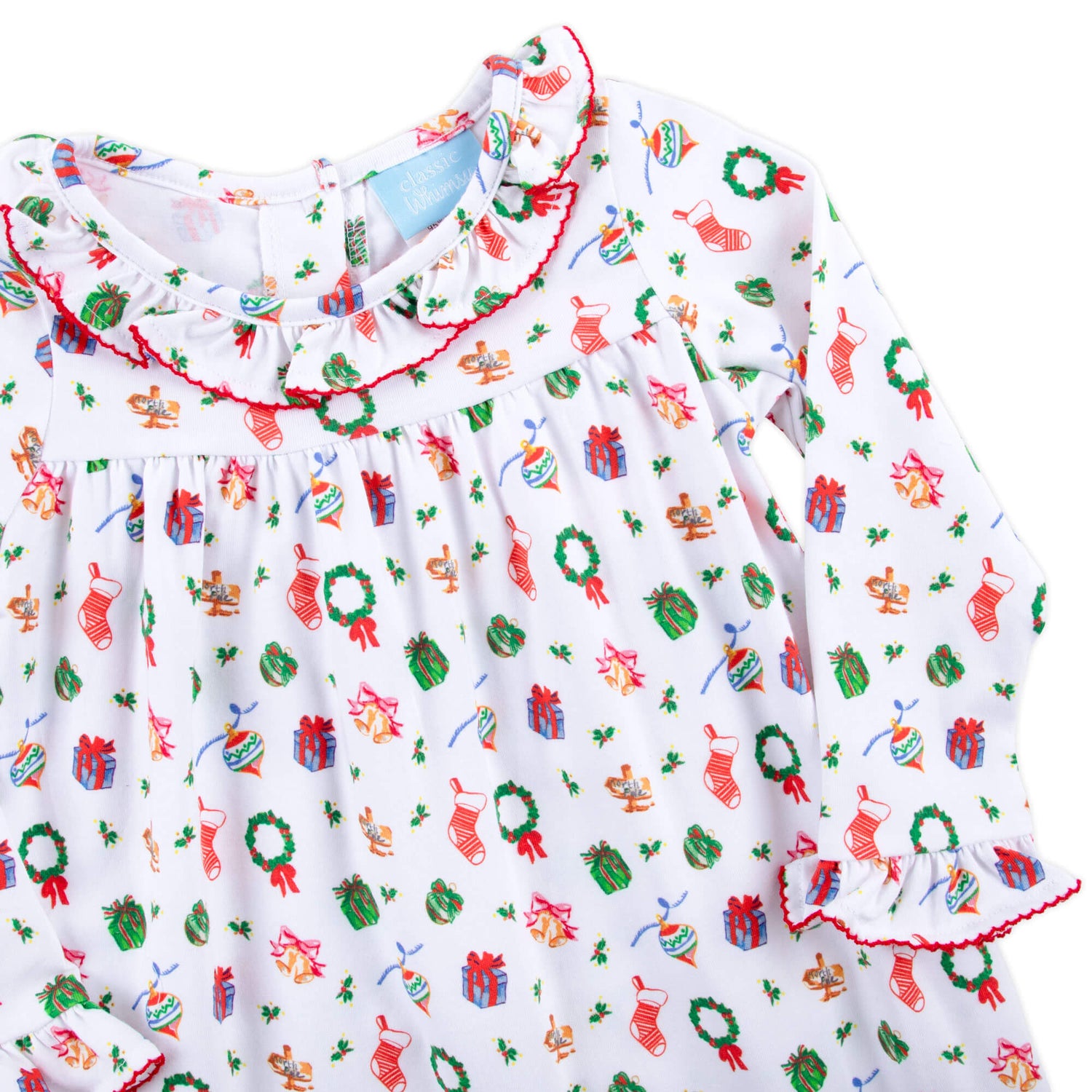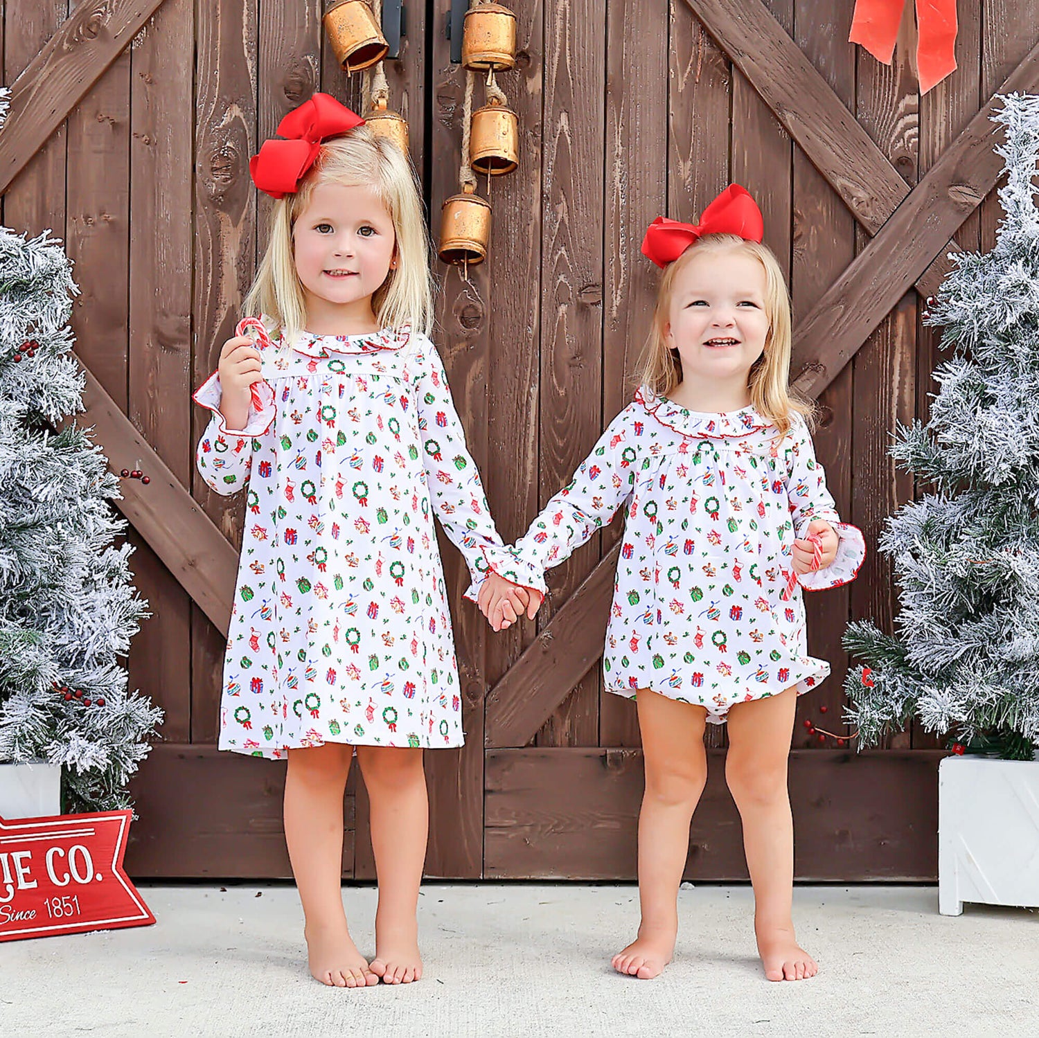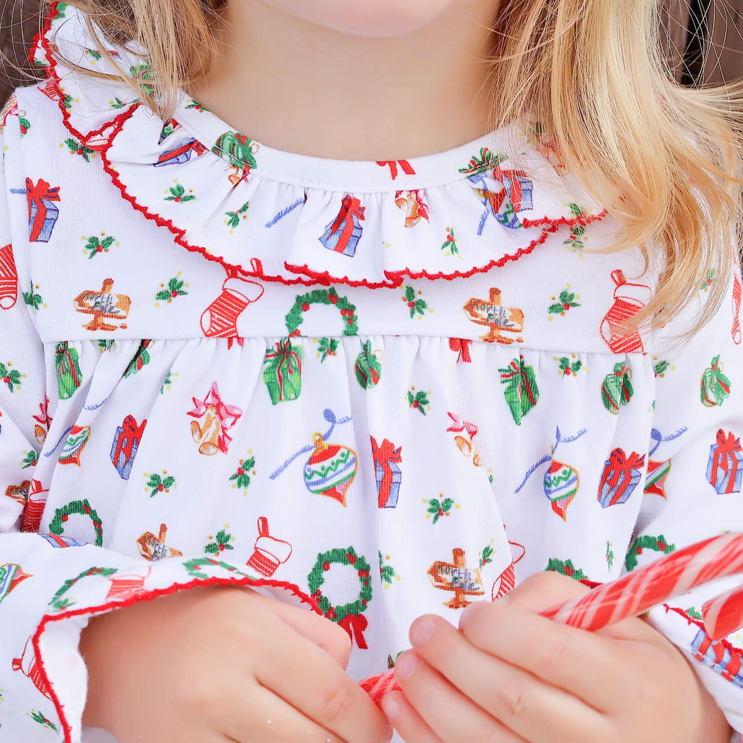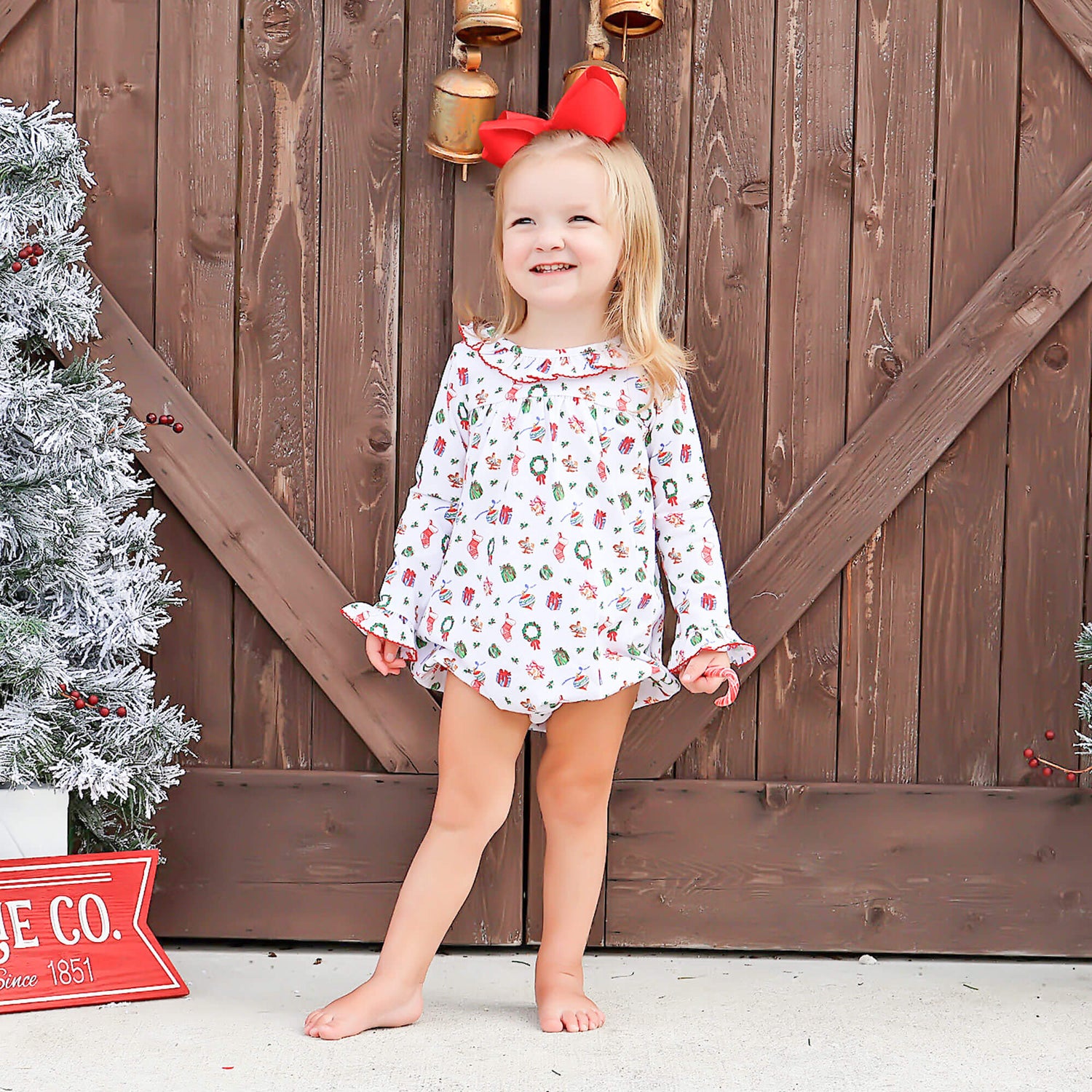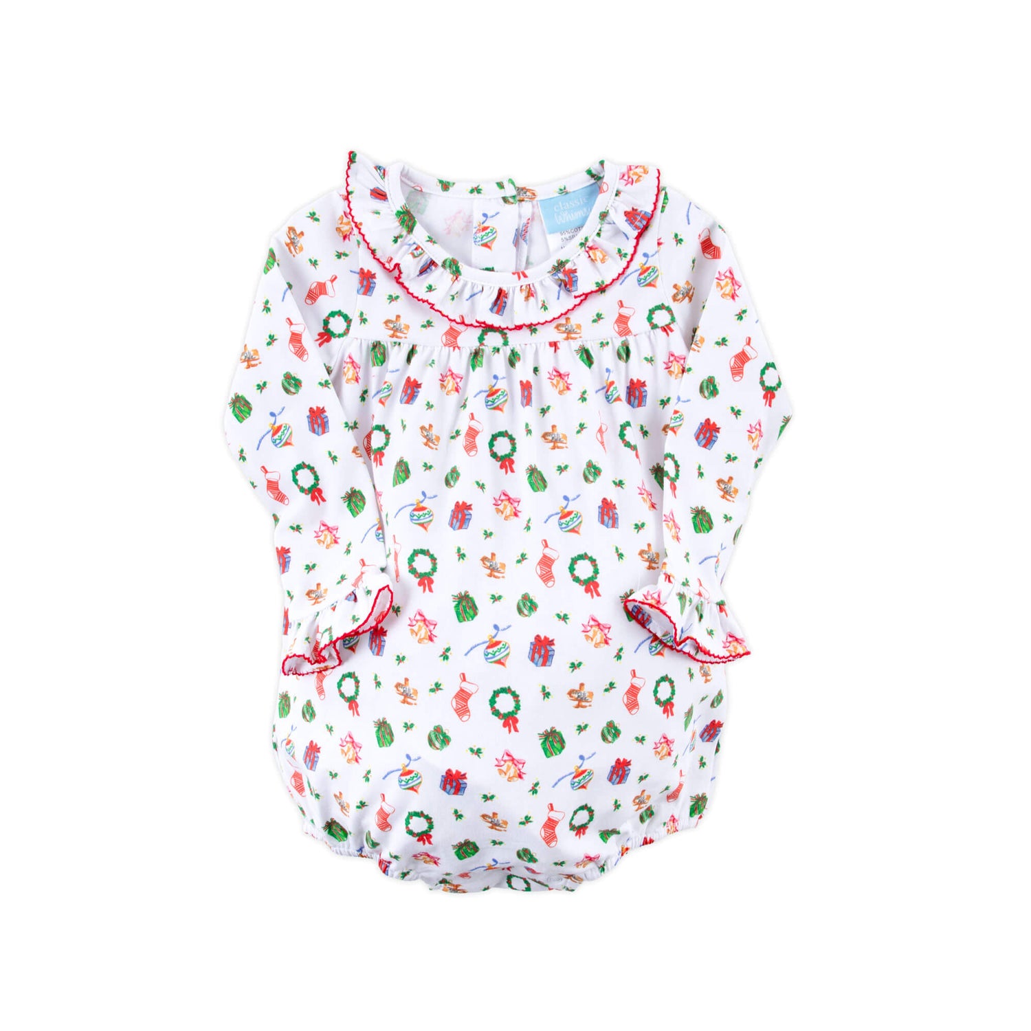 Celebrate Christmas in our Christmas Delights Ruffle Collared Bubble. This charming bubble features a Christmas themed print, a ruffle collar and long sleeves with red picot trim, making it perfect for the festive season. With snaps in stride for easy changing!