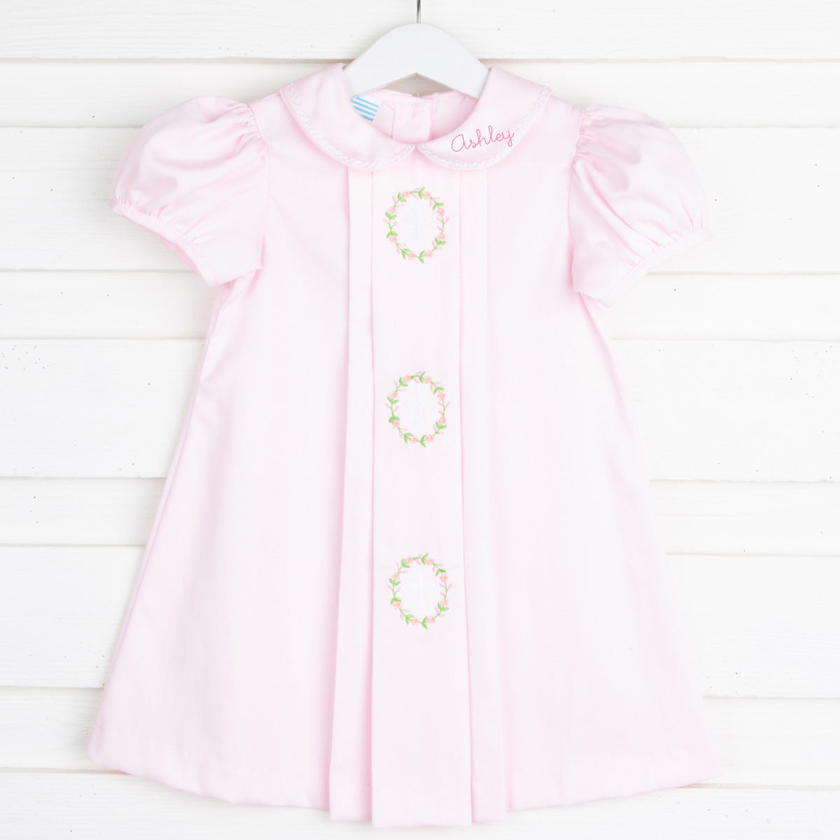 Make sure your little angel is stunning on her Christening Day, Easter or any special church event! This pink pique dress features the sweetest embroidered cross and wreath design down the center pleat of the dress. Peter Pan collar and puff short sleeves.