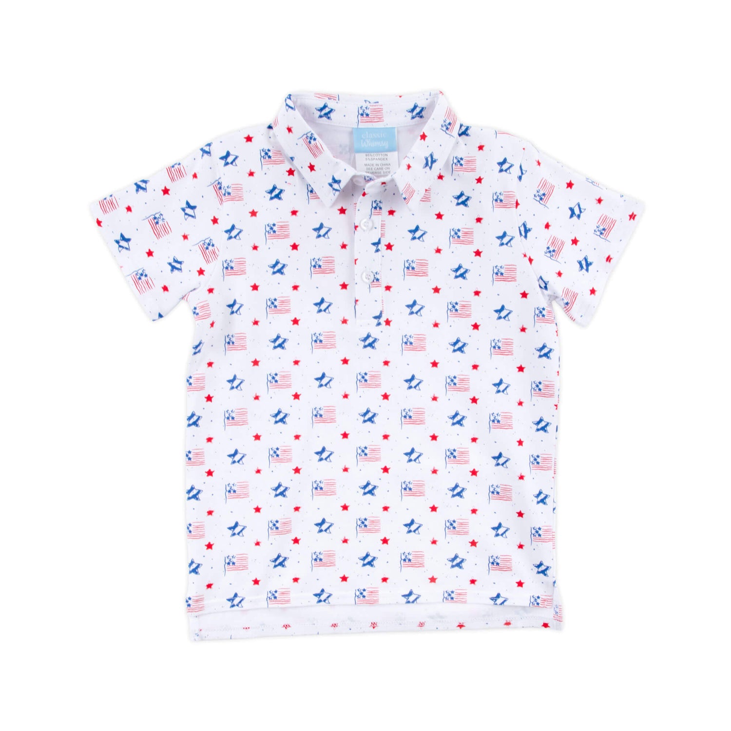 This boy's Flag Print Short Sleeve Polo Shirt is the perfect for watching fireworks. The soft knit polo features a patriotic flag and star print. Make it uniquely yours by adding a monogram. It's the ideal shirt for playtime fun, comfort, and cuteness at your patriotic events!
