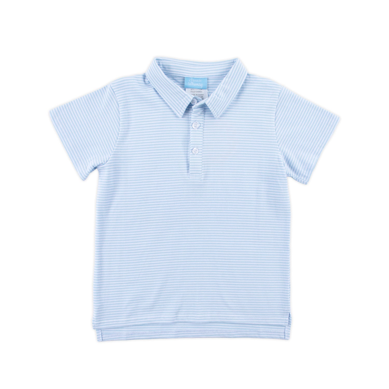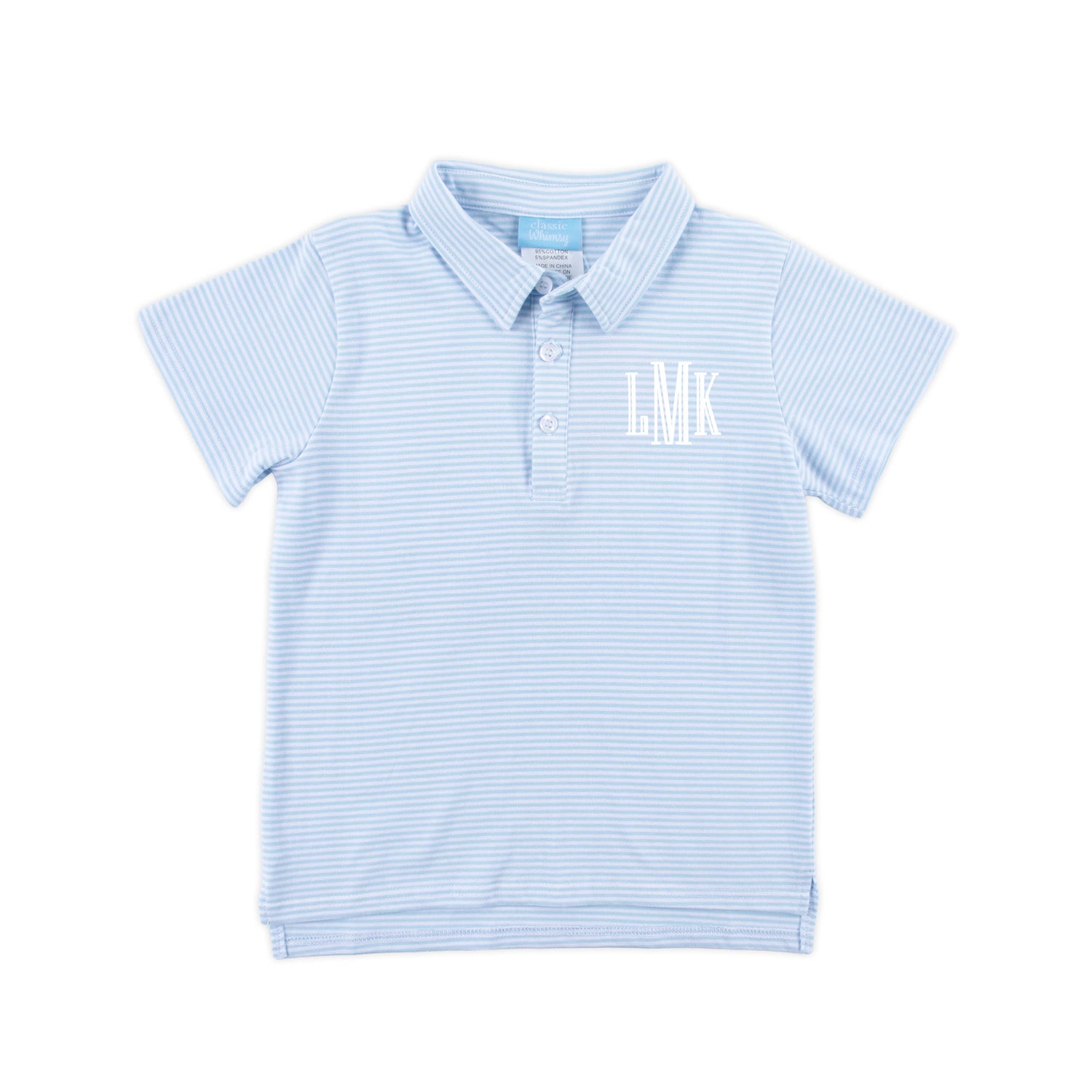 Dress up for playtime in our Light Blue Stripe Knit Polo. This classic light blue polo, with its timeless style, allows you to mix and match effortlessly with your favorite bottoms. Perfect for various occasions this spring and summer, this shirt brings a playful touch to any day. Consider adding a monogram to personalize your look and make a statement.
