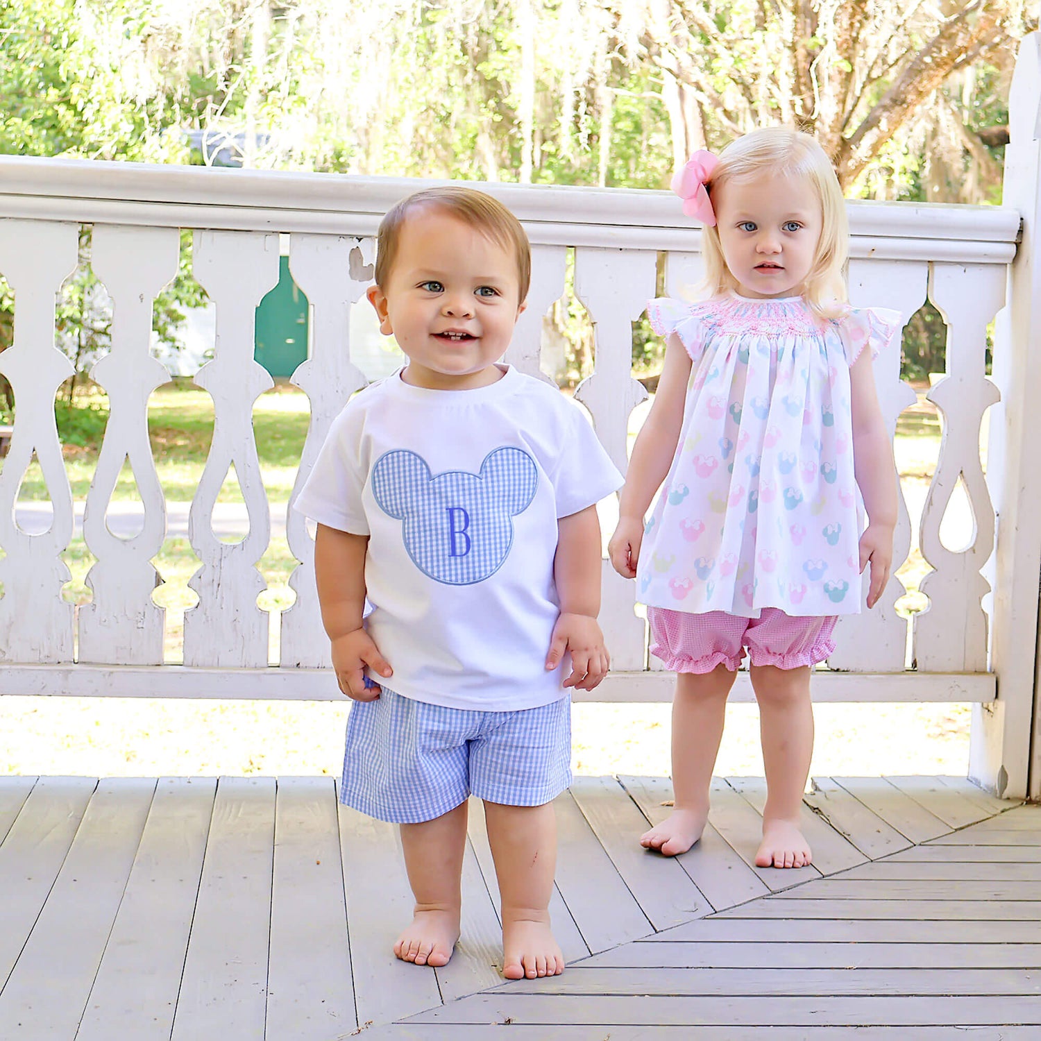 One of our most magical designs! This Pastel Mouse Ears Smocked Angel Sleeve Bloomer Set is perfect for a trip to your favorite theme park, birthday celebrations, and playtime. The top features a darling pastel mouse ears print, geometric smocking, and angel sleeves with pink picot trim. The set is coordinated with pink gingham bloomers.
