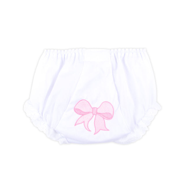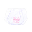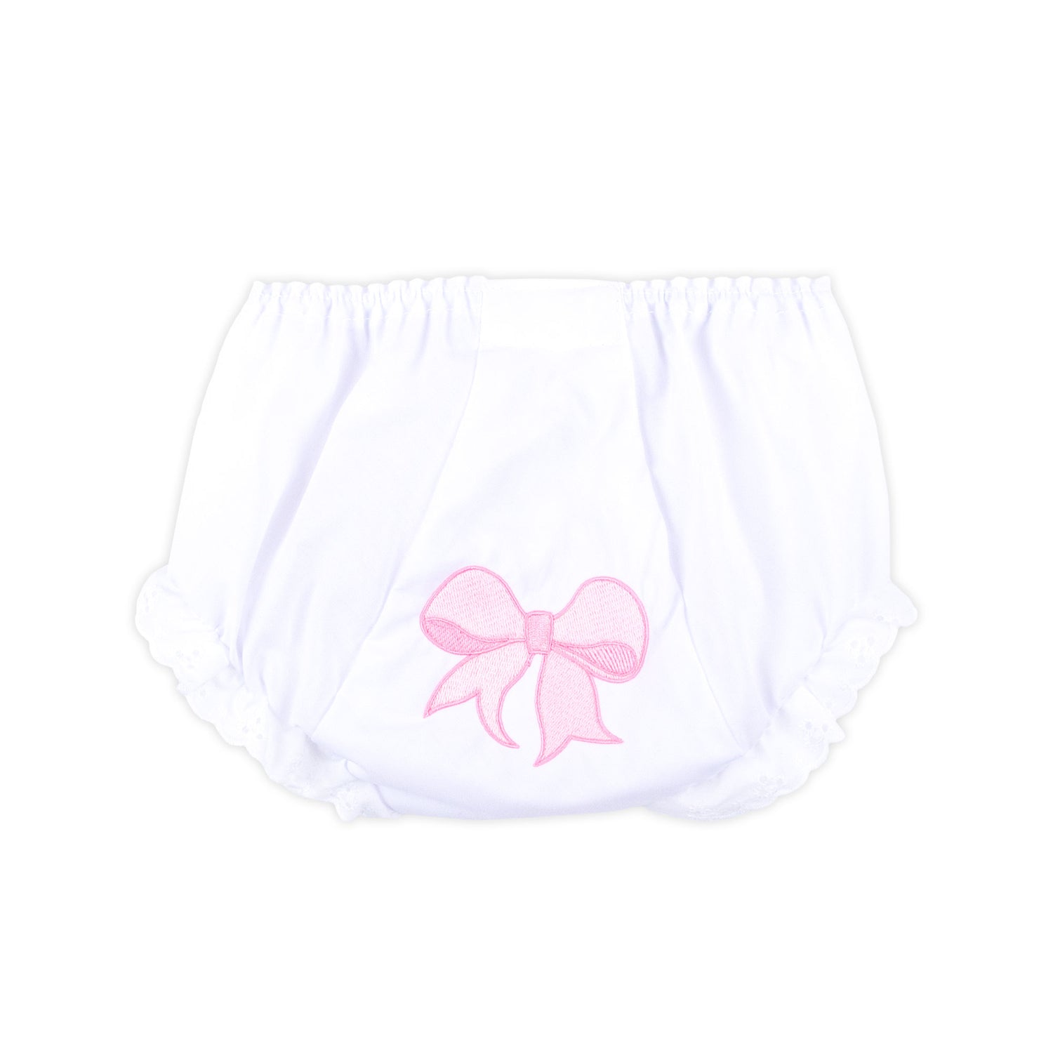 These Pink Bow White Bloomers feature an embroidered pink bow with eyelet trim detail, making them a perfect match for any outfit! Sizes NB-24m are baby girl diaper covers, while sizes 2T-6 years are toddler and big girl panties.
