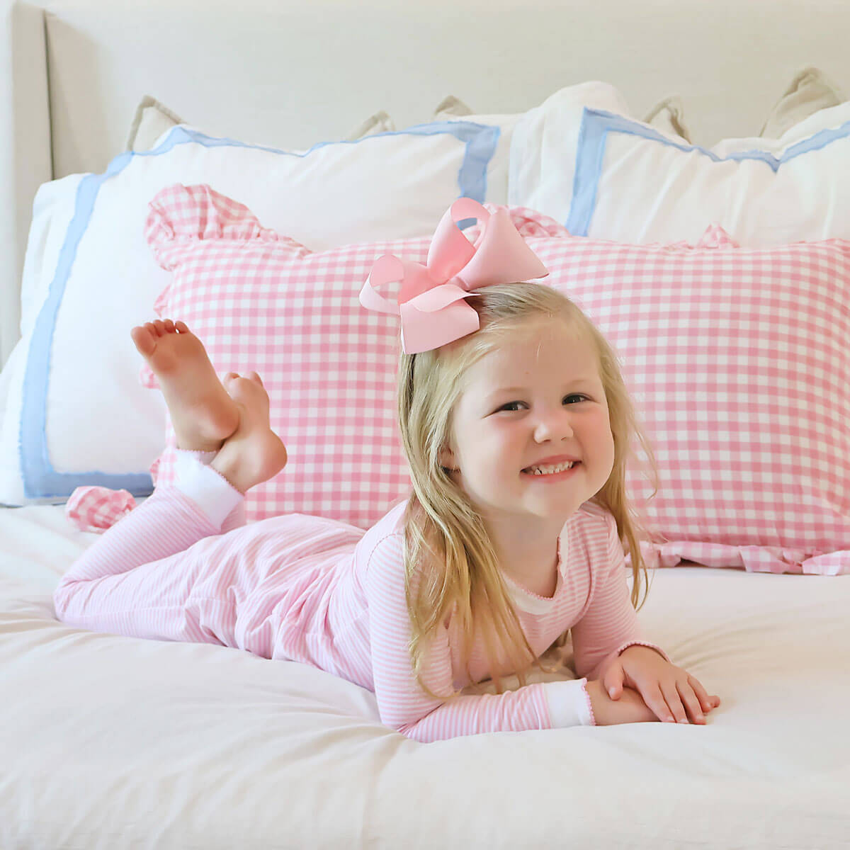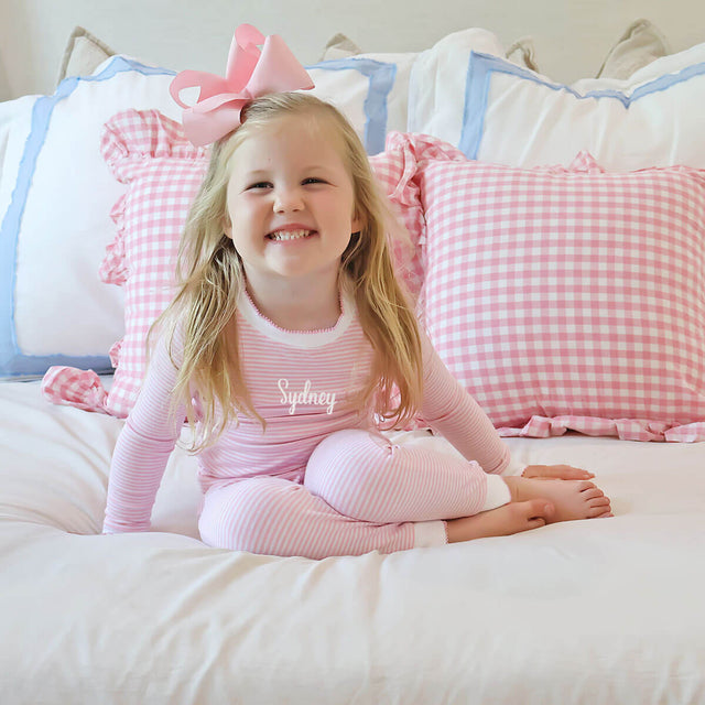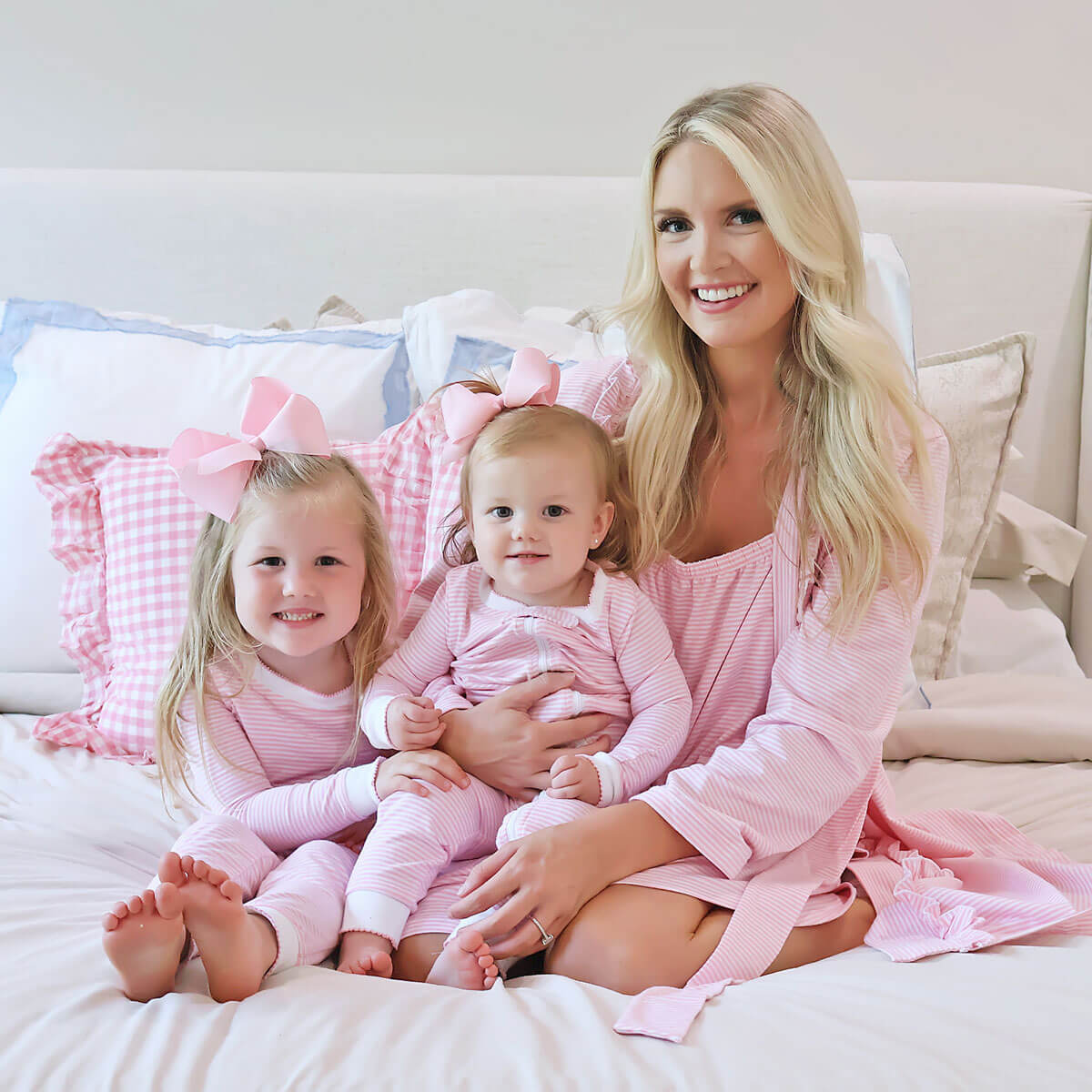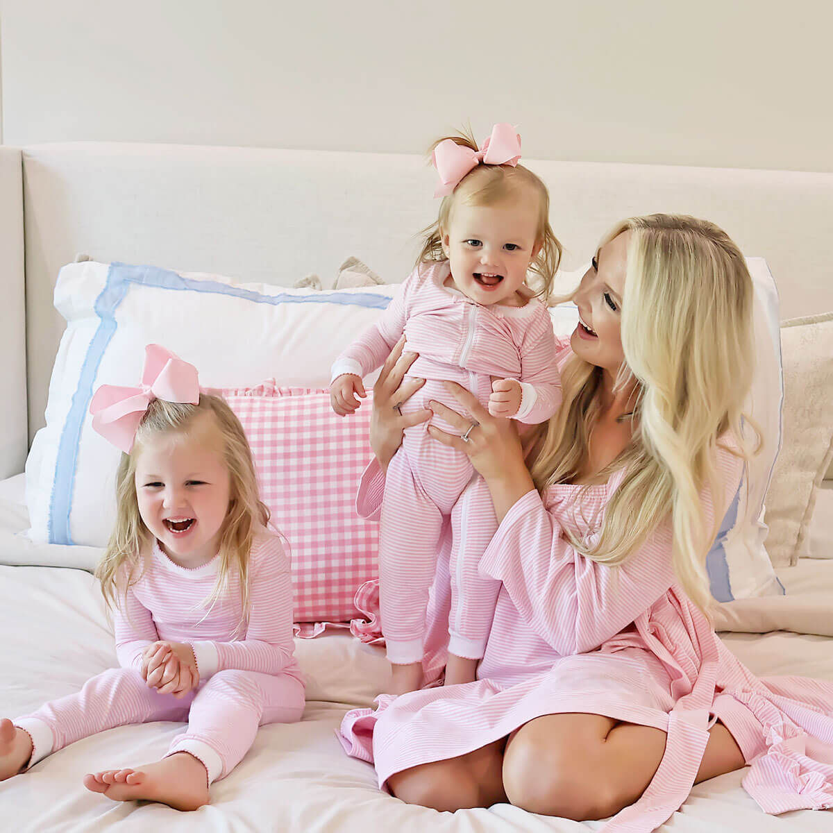 Get ready for bedtime in the cutest Pink Stripe Pajamas! Whether it's summer, winter, or something in between, these PJs are soft and snuggle-ready. Personalize with a monogram. Don't miss the matching ladies' style for mom or mix it up with the blue stripe version for brother or best friend!