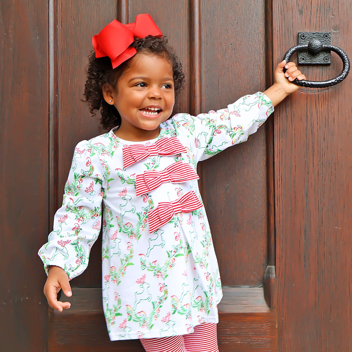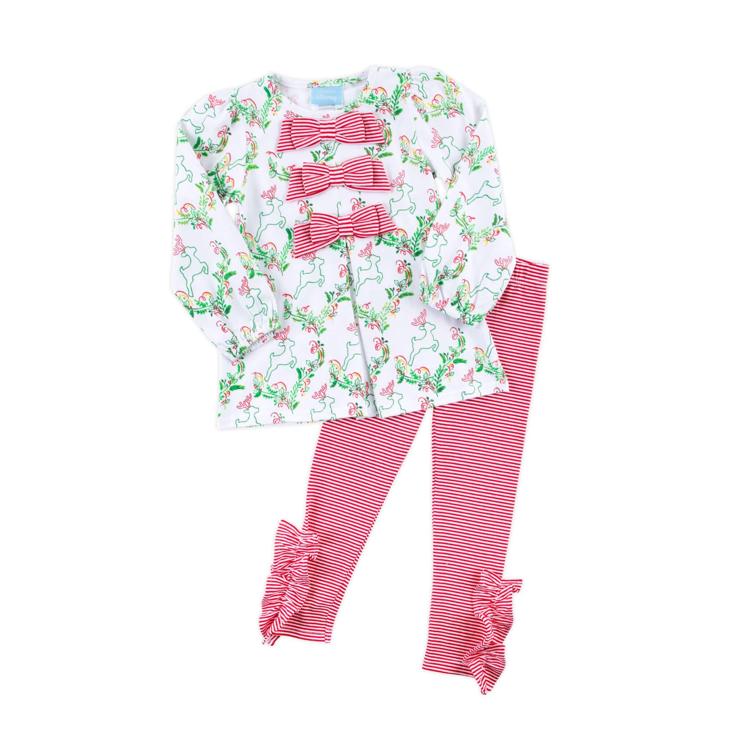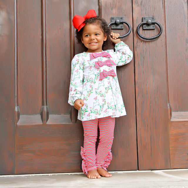 It's the holiday season, and our Prancing Reindeer Coco Legging Set is perfect for family photos! The long-sleeve top in a festive reindeer print features charming red stripe bows along the front and pairs perfectly with matching red stripe ruffle leggings. This outfit is sure to make your little one stand out at any Christmas event.