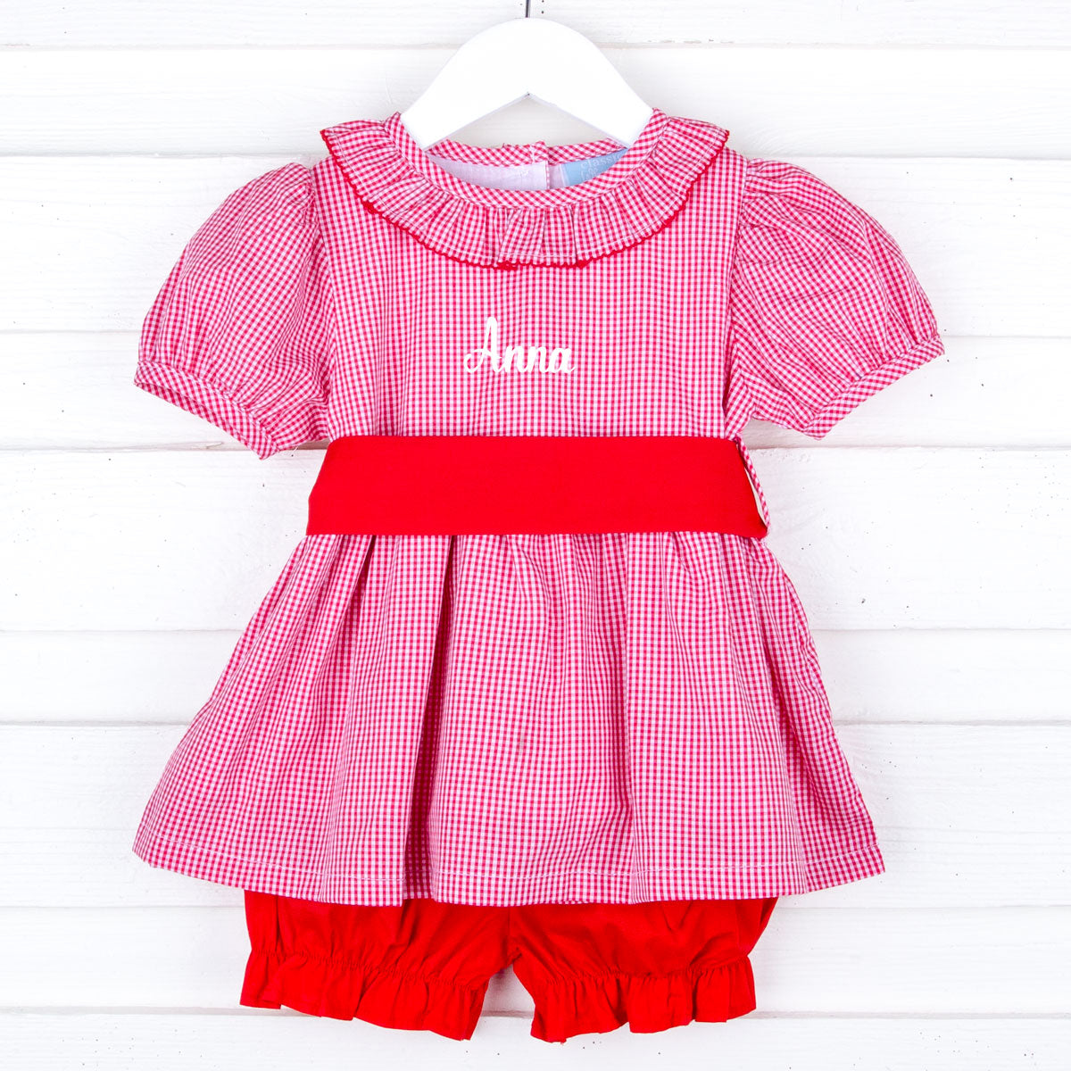 Your little one will look absolutely adorable in our Red Gingham Sash Bloomer Set The red gingham top features a sweet ruffle collar, bishop sleeves, and a red sash. Paired with matching bloomers, this set is perfect for any occasion. Plus, you can add a monogram to make it extra special and uniquely hers!