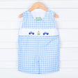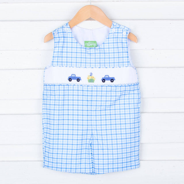Celebrate your little one's special day with our Second Birthday Smocked Blue Check Jon Jon! This blue check Jon Jon features hand-smocked cupcakes and trucks, with convenient snaps in the stride for easy changing.