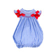 This Summer Blues Smocked Angel Sleeve Bubble is the sweetest patriotic outfit. Designed from blue gingham fabric, this bubble features geometric smocking and is adorned with red satin bows. It features angel-style sleeves with red picot trim, adding to its charm. Snaps in stride make dressing up your little one easy and convenient.