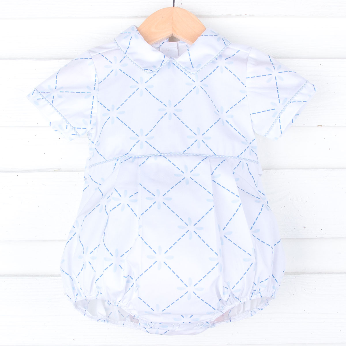 This Touch of Blue Collared Bubble is elegantly adorable for every season! With its charming Touch of Blue print, it’s a sweet and sophisticated choice for your little one. Perfect for coordinating with siblings for those special family moments. Add a monogram for a personalized touch. Snaps in stride ensure effortless changes.