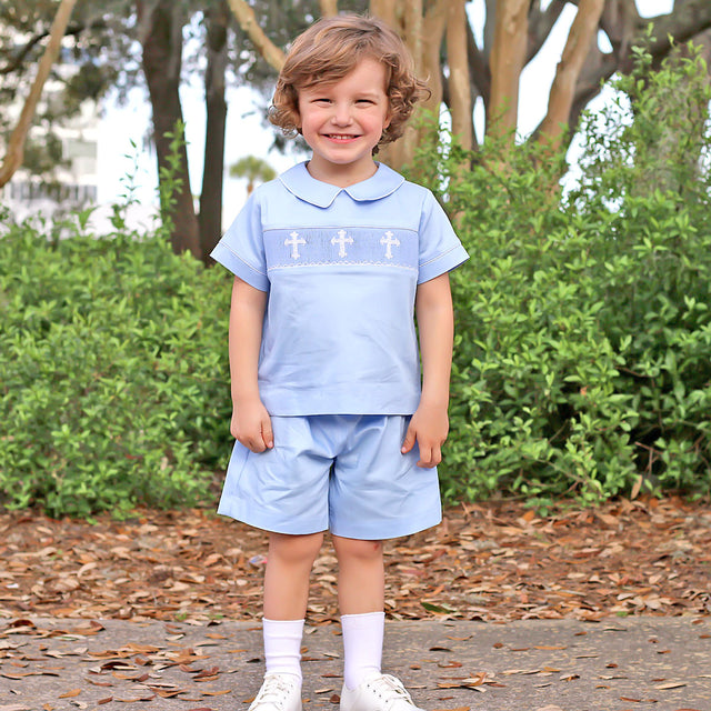 Your little guy will look precious on his Christening Day or any church events! The light blue pique shirt features hand-smocked white crosses. The set is coordinated with matching light blue waistband shorts.