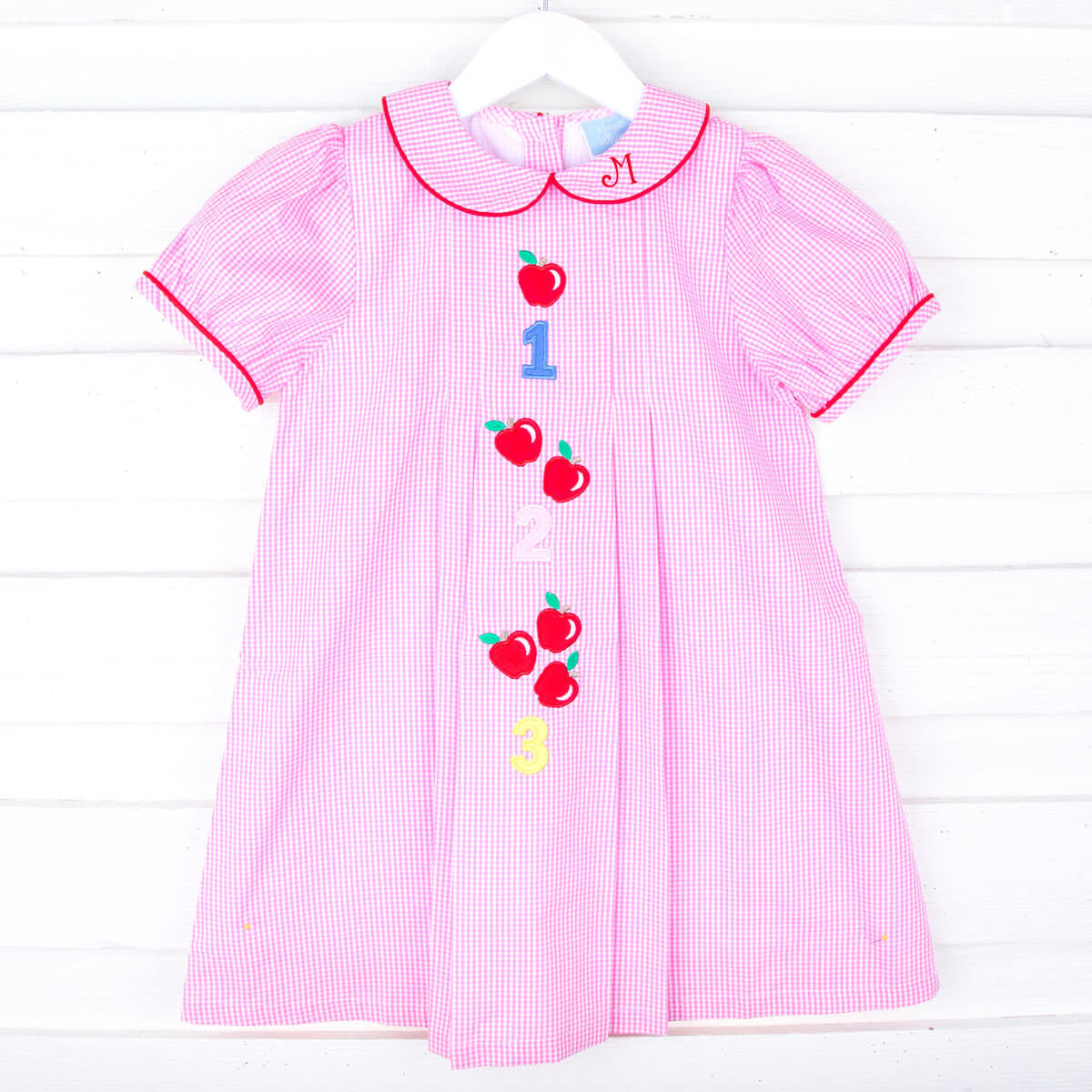 Kick off the school day with our 123 Apples Pink Gingham Camila Dress. This Camila-style dress in pink gingham is both fun and stylish, perfect for the first day of school. The dress features charming appliqués of 123 numbers and sweet red apples, along with a Peter Pan collar and pleated details. Short puff sleeves with red trim.