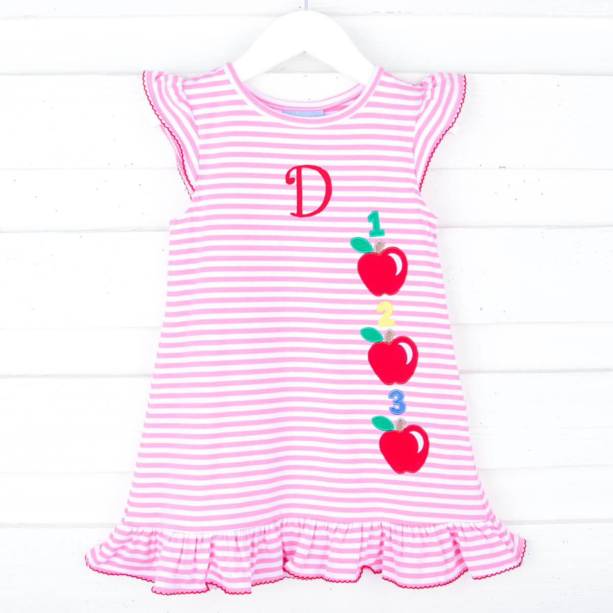 Kick off the school day with our 123 Apples Pink Stripe Milly Dress. This Milly-style dress in pink knit stripes is both fun and stylish, ideal for the first day of school. The dress features charming appliqués of 123 numbers and sweet red apples. Personalize the outfit with a monogram for an extra special touch.