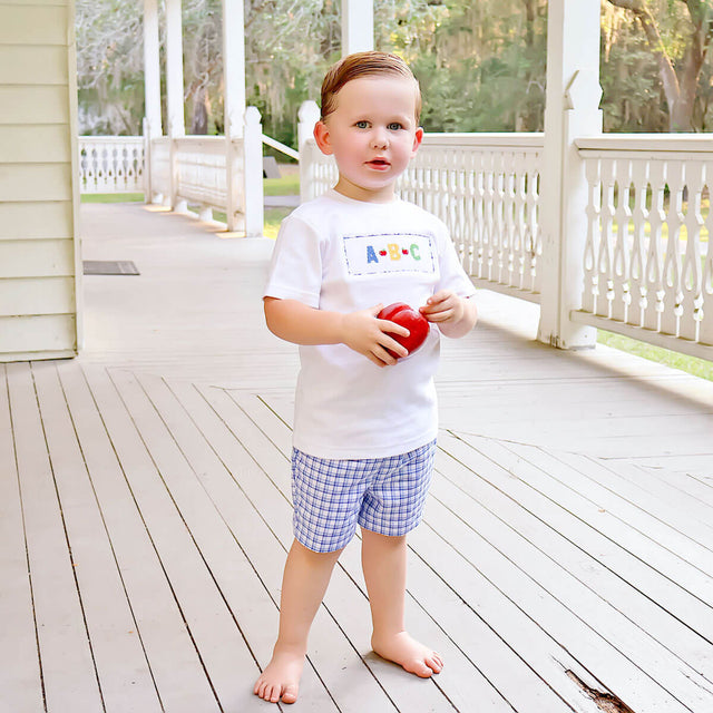 Begin the school year in style with our charming ABC Smocked Blue Plaid Short Set. The white knit shirt boasts charming smocked "ABC" and apple designs, while the set comes complete with elastic pull-on waist blue plaid shorts, ensuring versatility for both school and playtime.