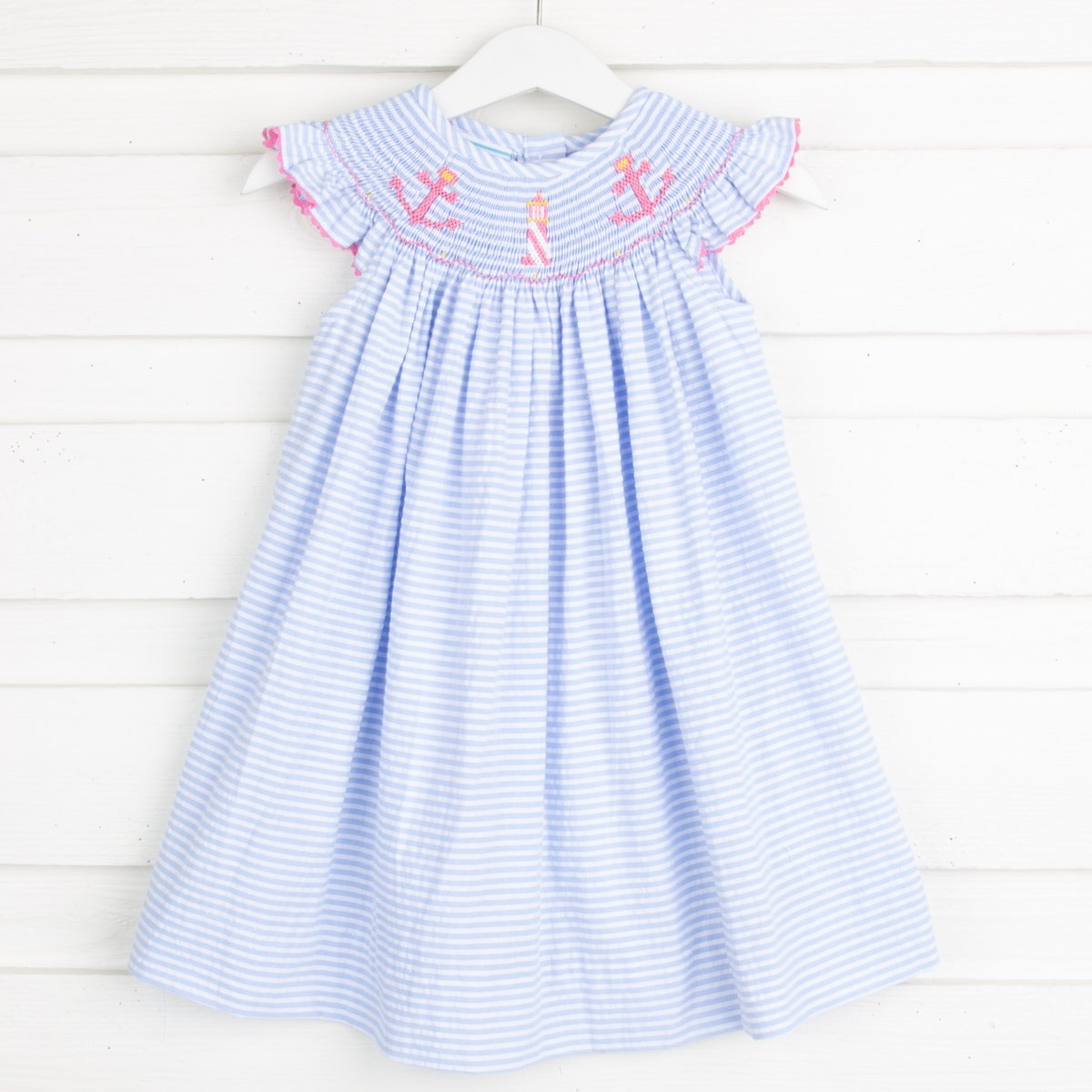 One of our favorite Summer dresses! We think the blue seersucker stripe pairs perfectly with anchor smocking.