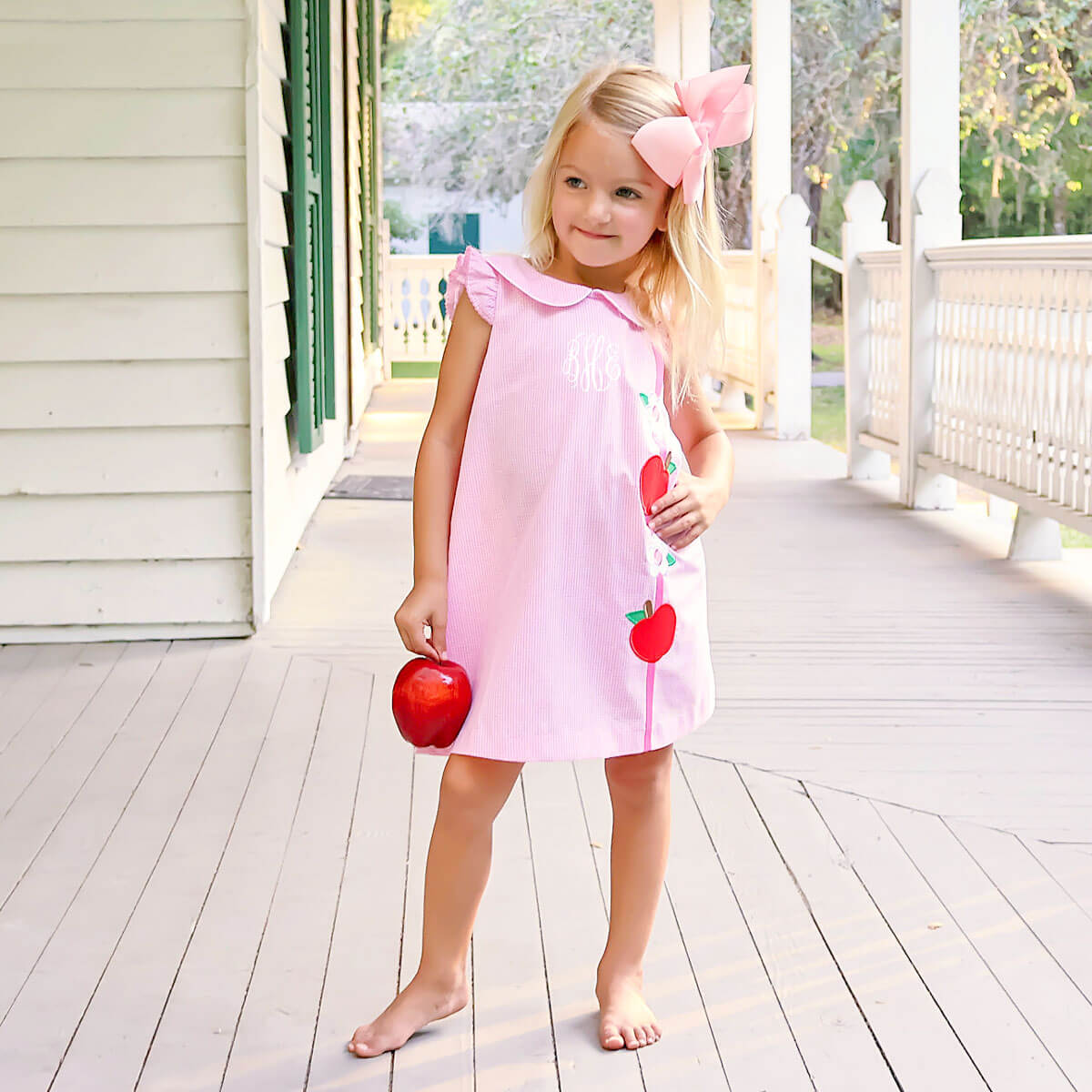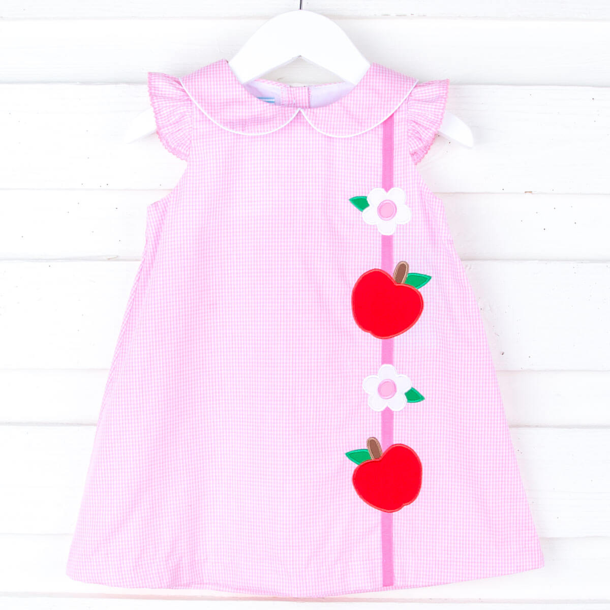 Indulge in the sweetness of our Apple & Flower Pink Gingham Sally Dress, an ideal choice for the fall season or back-to-school events. This charming Sally-style dress, adorned with delightful red apple and flower appliqués on pink gingham fabric, exudes a playful charm. Personalize the outfit by adding a monogram for a custom touch that truly makes it your own. Ideal for all your fall activities, this dress is a delightful addition to your little one's wardrobe.