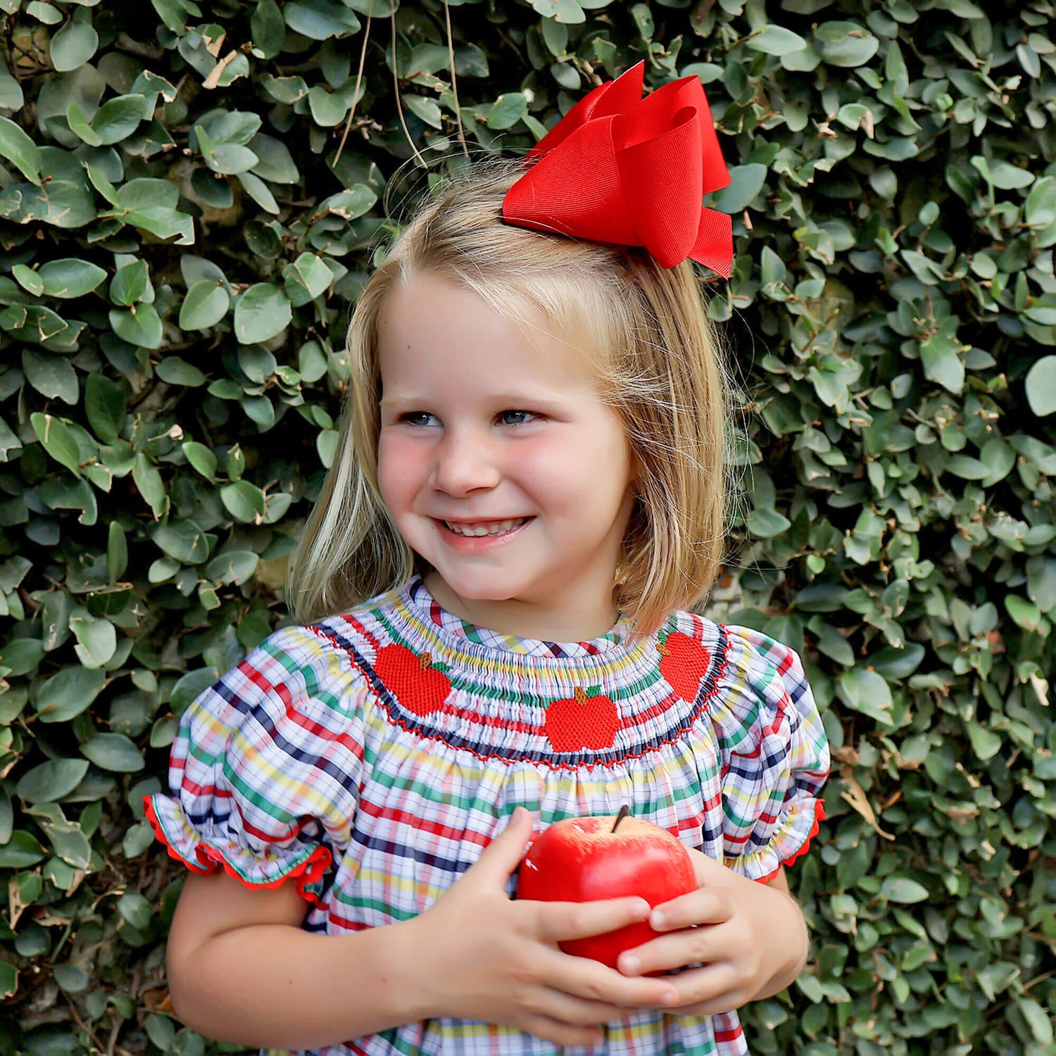 Your little one will be absolutely adorable in our Apple Trio Primary Plaid Smocked Bishop Dress, a perfect choice for both starting the school year and picture day. This dress features adorable hand smocked apples across the neckline. Complete with bishop-style sleeves adorned with red ric rac trim, it's a charming addition to any wardrobe.