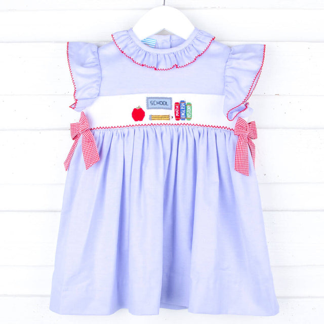 Prepare for the new school year or picture day with our charming Back To School Smocked Light Blue Beverly Dress. This light blue oxford Beverly-style dress features smocked books, a pencil, and an apple, adding a touch of sweetness. It's also adorned with red gingham side tie bows for an extra sweet touch.