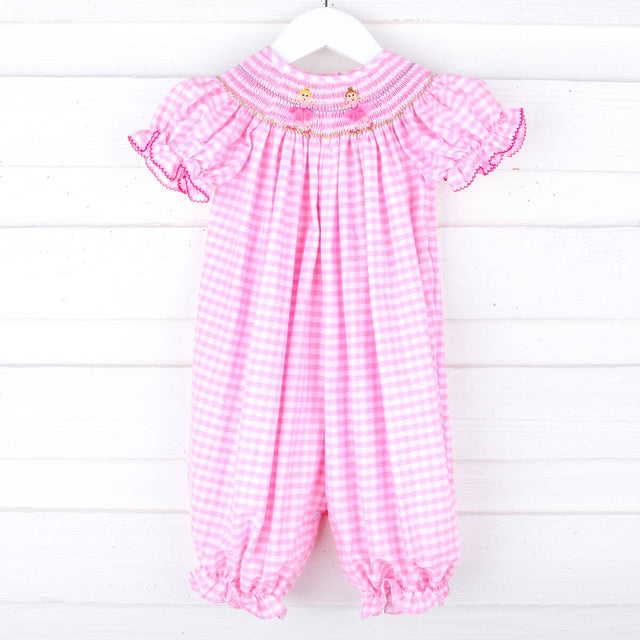 Your little dancer will absolutely love twirling in this Ballerina Smocked Pink Gingham Long Bubble! It's adorable with its sweet pink gingham and hand-smocked ballet dancers. Plus, the bishop-style sleeves with hot pink picot trim add a charming touch. Easy snaps make dressing a breeze!