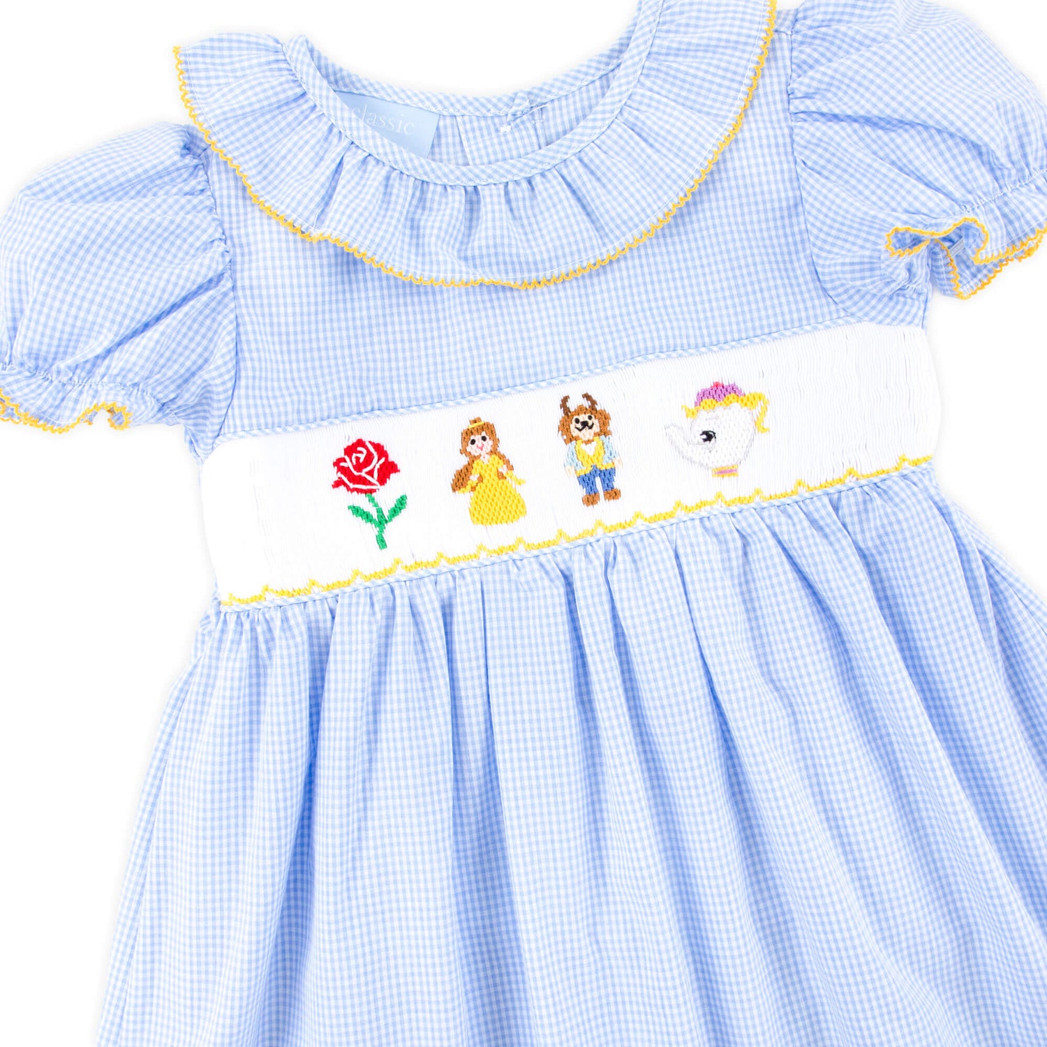 Perfect for tea parties or birthdays, the Beauty Princess Smocked Dress is a delightful choice! This blue gingham dress features hand-smocked beauty princesses and charming ruffle details along the collar.