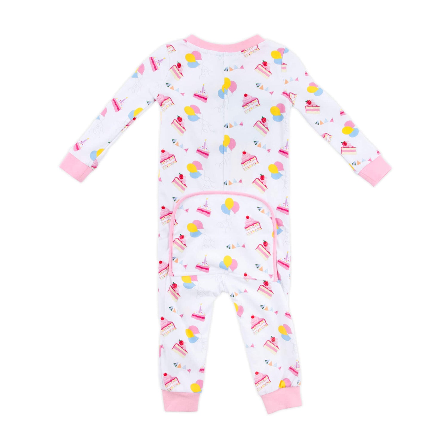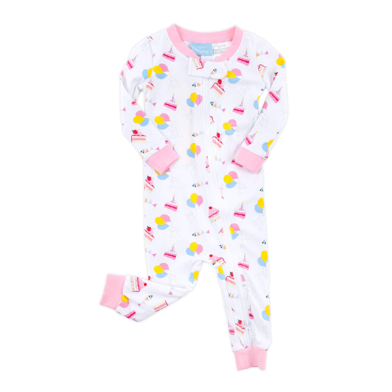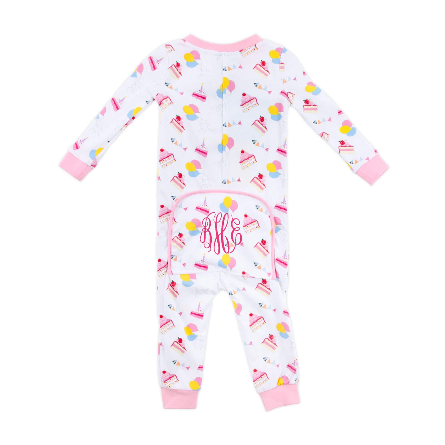 Your little one will be warm and comfortable sleeping in our Birthday Cake Zip Sleeper. Features the cutest birthday print with a cake and balloons. Makes the perfect birthday gift! Make this onesie extra special by adding a monogram! Easy zip-up front zipper! Back flap is sewn down. Selected sizes available footed & footless.