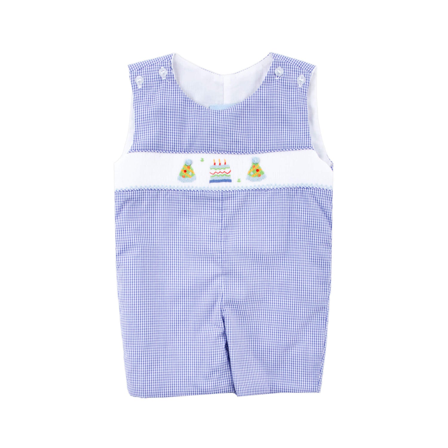 Celebrate your little one's special day in style with our Birthday Smocked Royal Jon Jon! Adorned with charming smocked cakes and party hats on a royal blue gingham fabric, it's perfect for the occasion. Designed with convenient shoulder buttons and snaps in stride for easy dressing