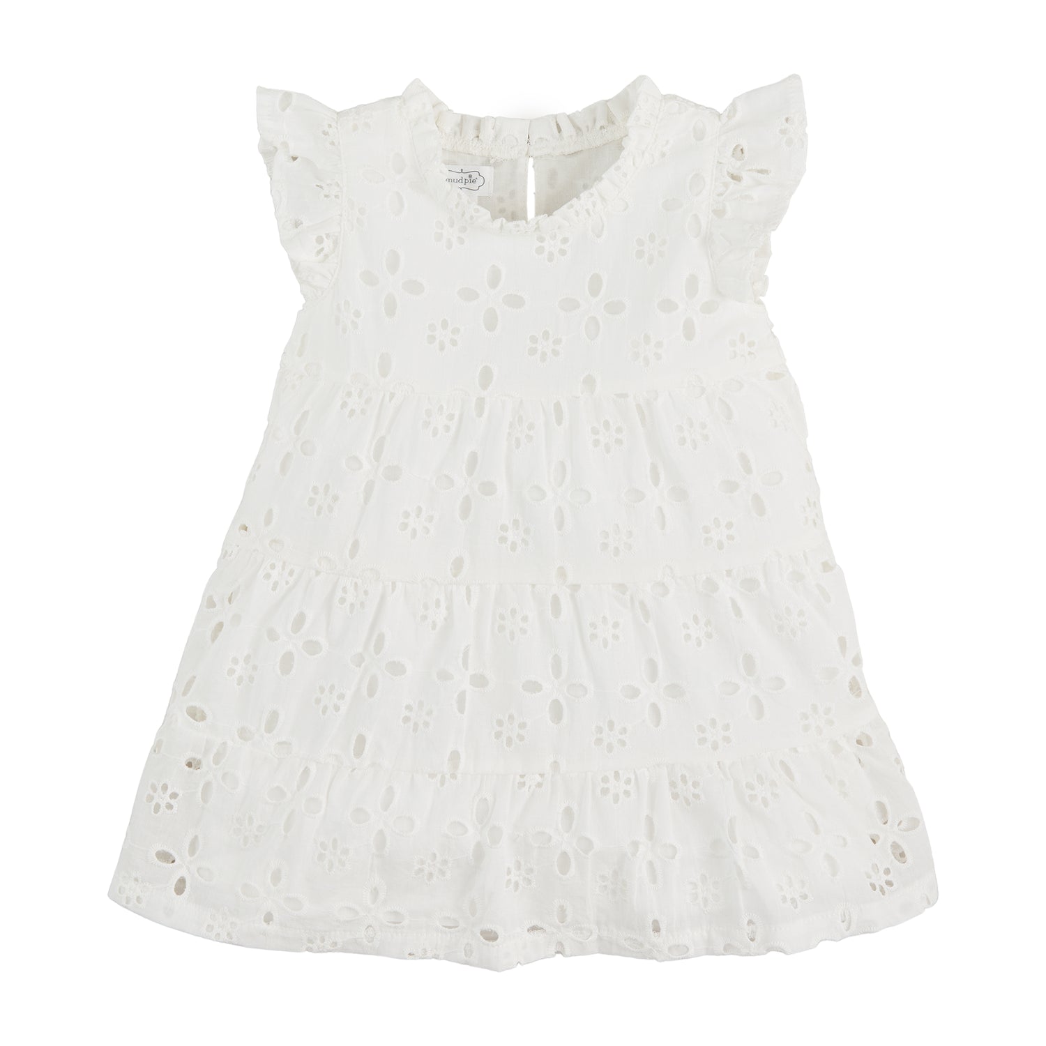 This sweet Mini Lula Eyelet Dress from Mud Pie features flutter sleeves, ruffle collar and lined interior. Don't miss your matching moment with the Bianca Eyelet Top for ladies.