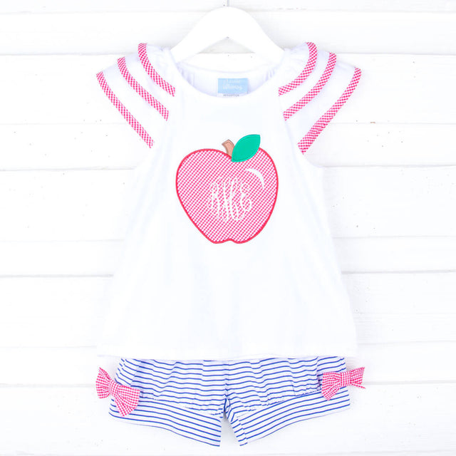 Have a fabulous first day of school in our Good Apple White Milly Short Set. The white knit Milly-style top features ruffle sleeves with red gingham tape trim. A charming large apple appliqué adorns the center of the top. You also have the option to add a monogram to the center of the apple for a personalized touch. This set comes with blue stripe knit shorts adorned with a bow on each side.