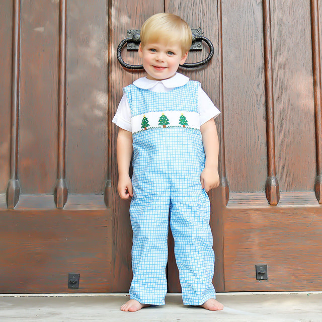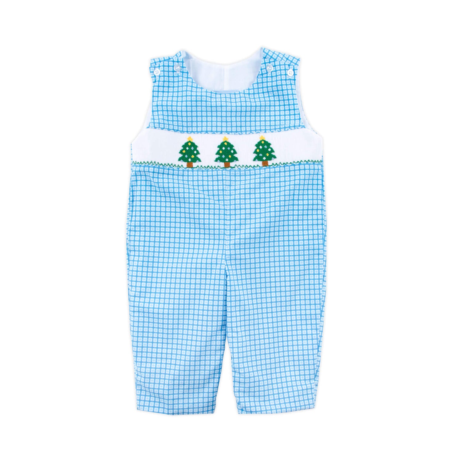 Prepare your little one for the holiday season with this Christmas Tree Smocked Light Blue Gingham Longall. This light blue gingham longall features smocked Christmas trees with snaps in stride for easy changing.