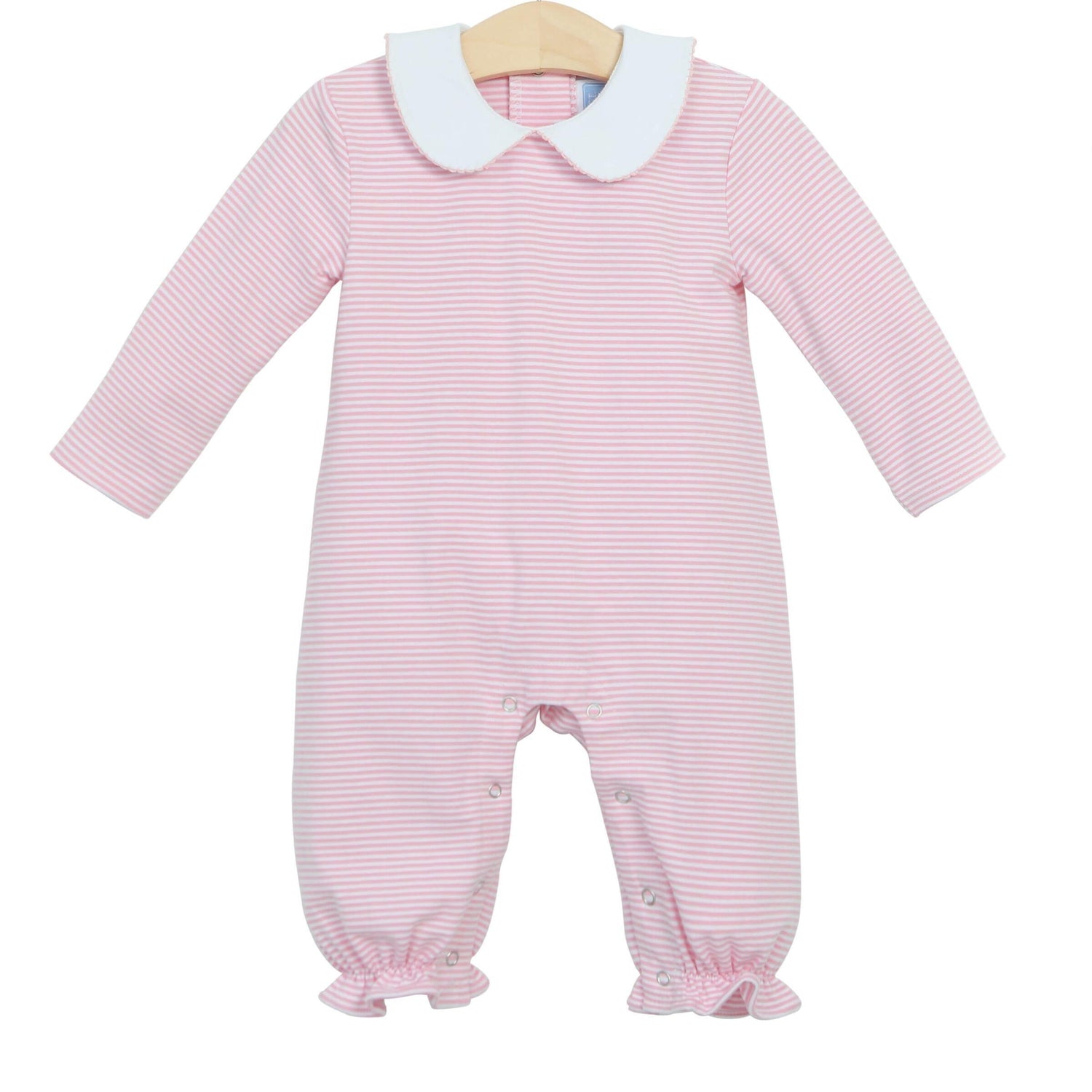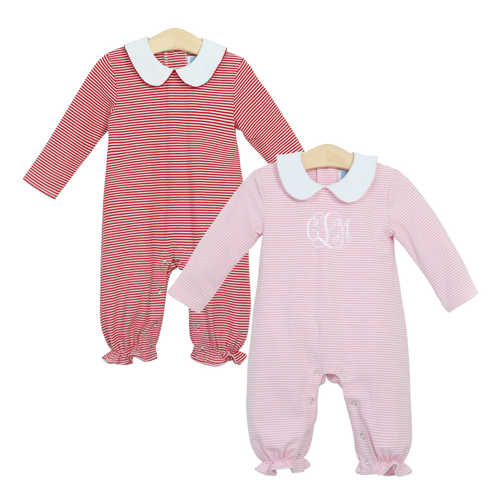 How sweet is this Claire Knit Stripe Romper? It's the perfect outfit for playtime fun! Available in two colors, pink and red, this knit romper features long sleeves and snaps in stride for easy changes. Add a monogram to personalize this adorable outfit.