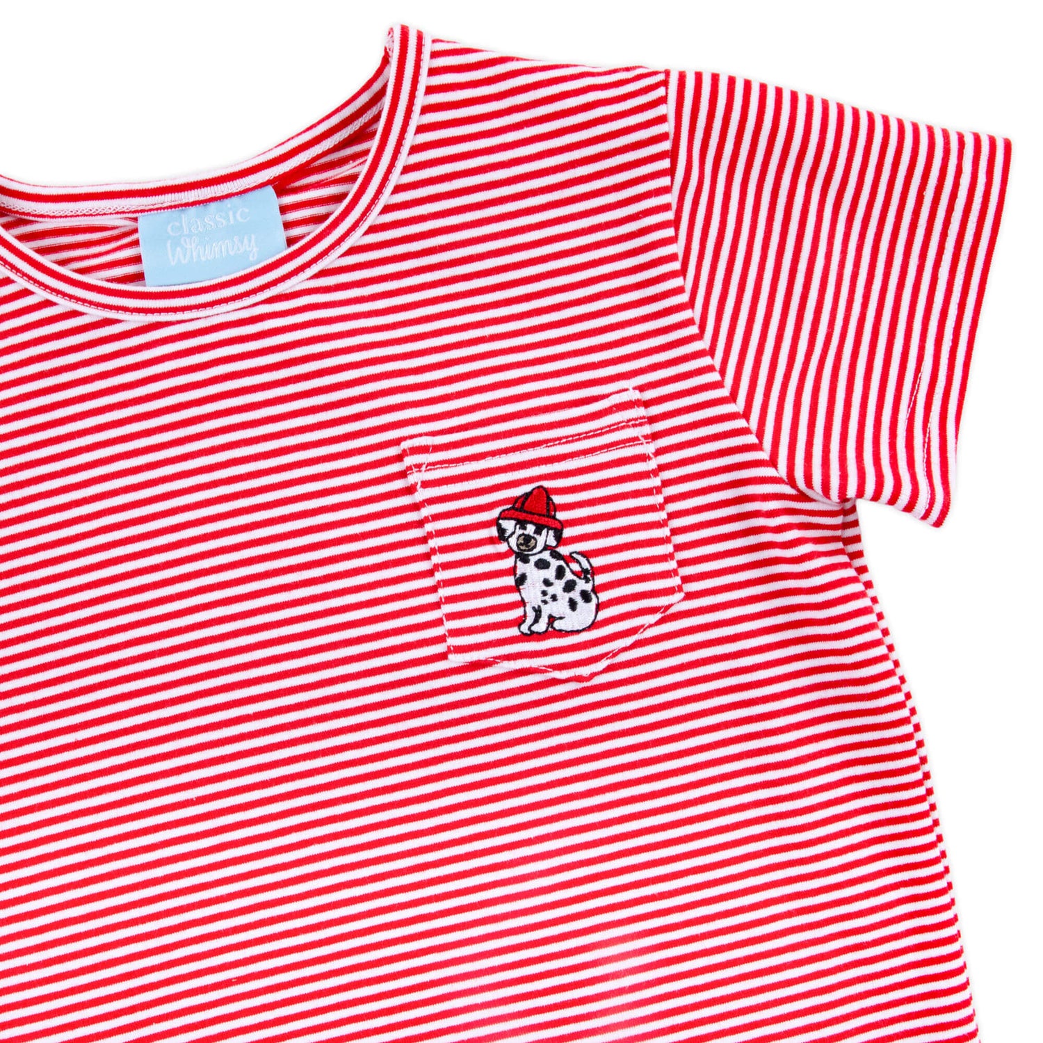 This Firehouse Dog Red Stripe Short Sleeve Pocket Shirt is perfect for playtime fun. Made from a soft red stripe knit, this short sleeve shirt features a side pocket with an embroidered fire rescue dalmatian for an extra cute touch. Easy to wear and full of personality, it’s a favorite choice for everyday adventures.