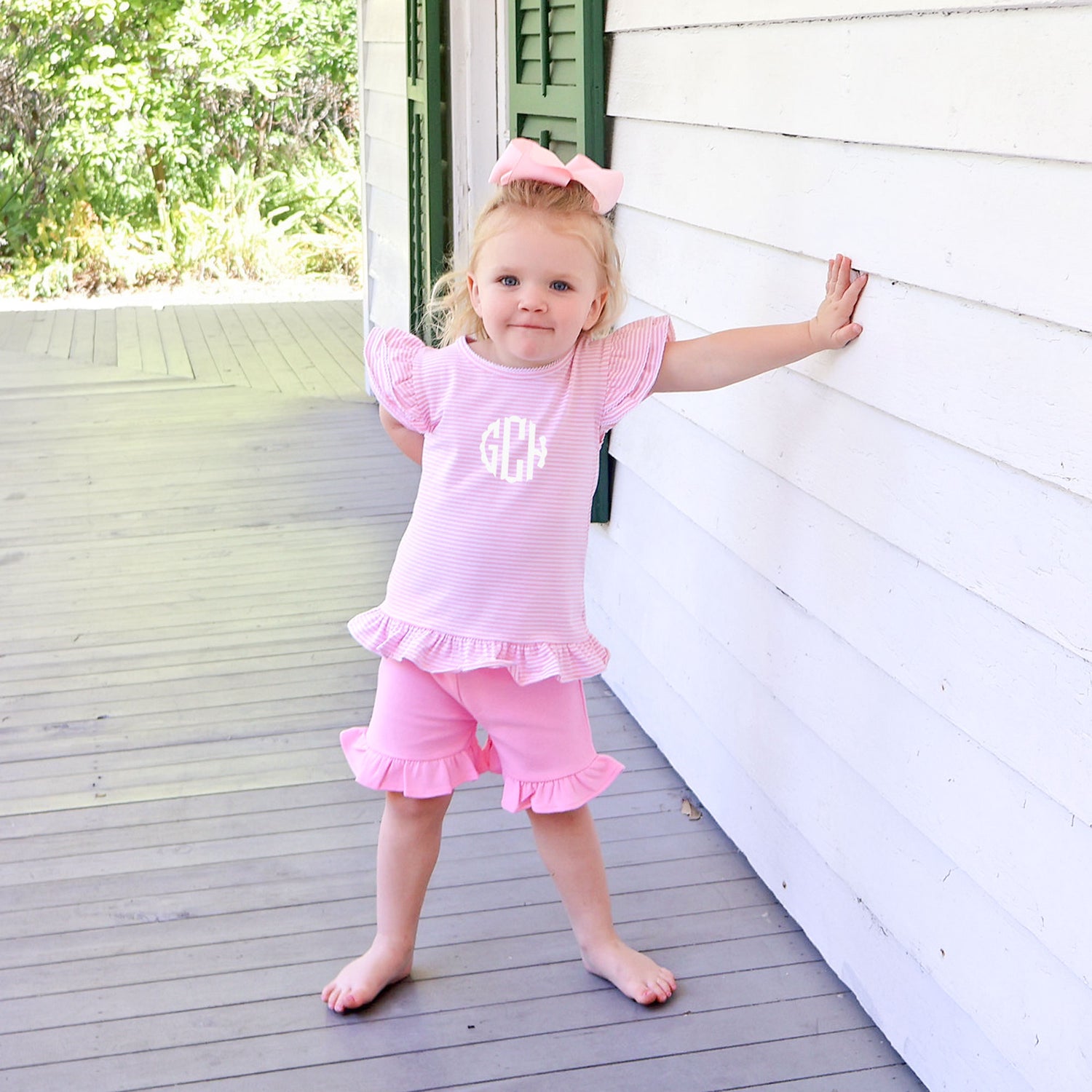 Your girl will adore wearing the Pink Stripe Milly Short Set throughout the entire Spring and Summer! This knit Milly-style top features charming double ruffle sleeves and a bottom hem. This set includes solid light pink ruffle shorts in a soft knit with an easy elastic waist. Enhance its charm with a monogram for a special touch. It's the perfect outfit for playtime.