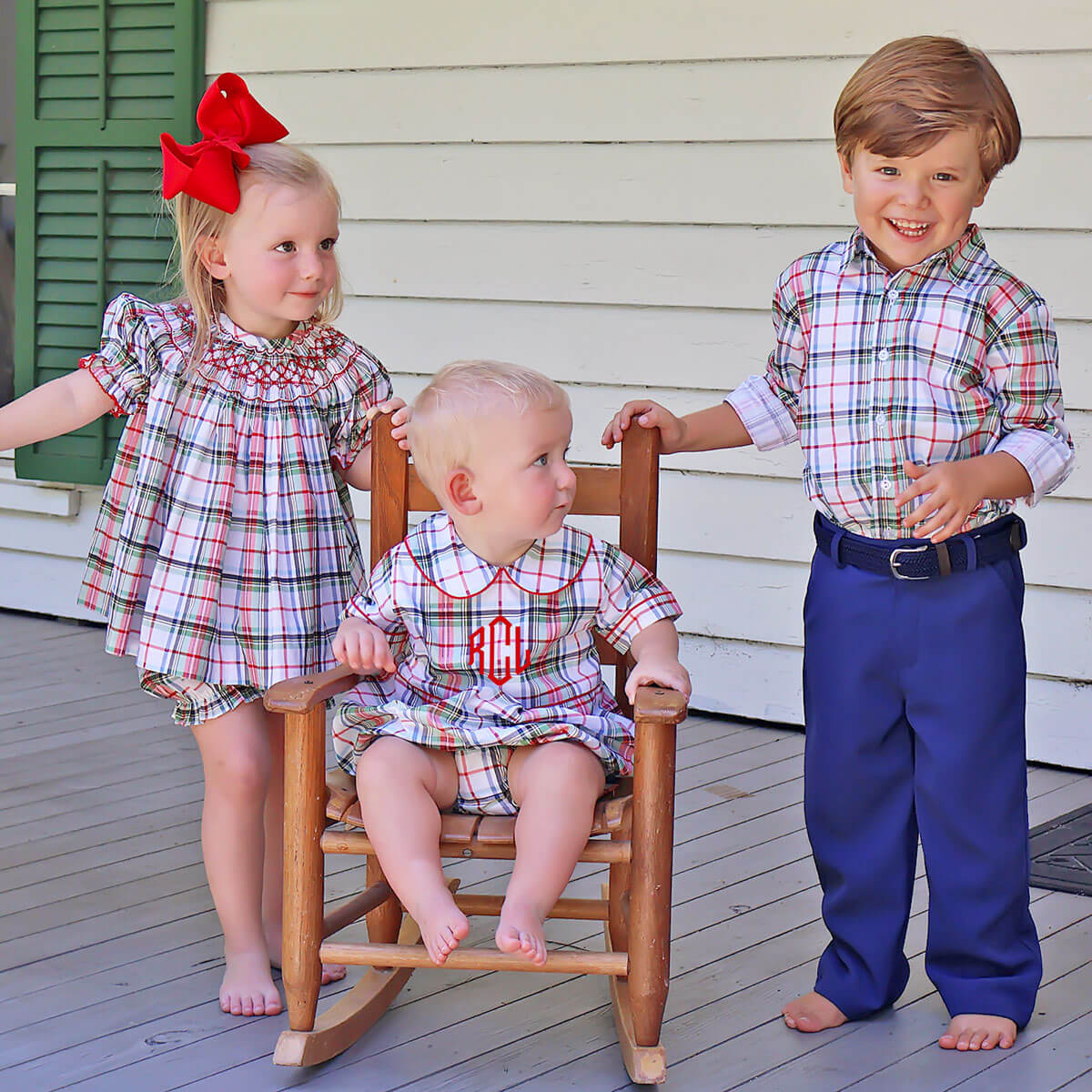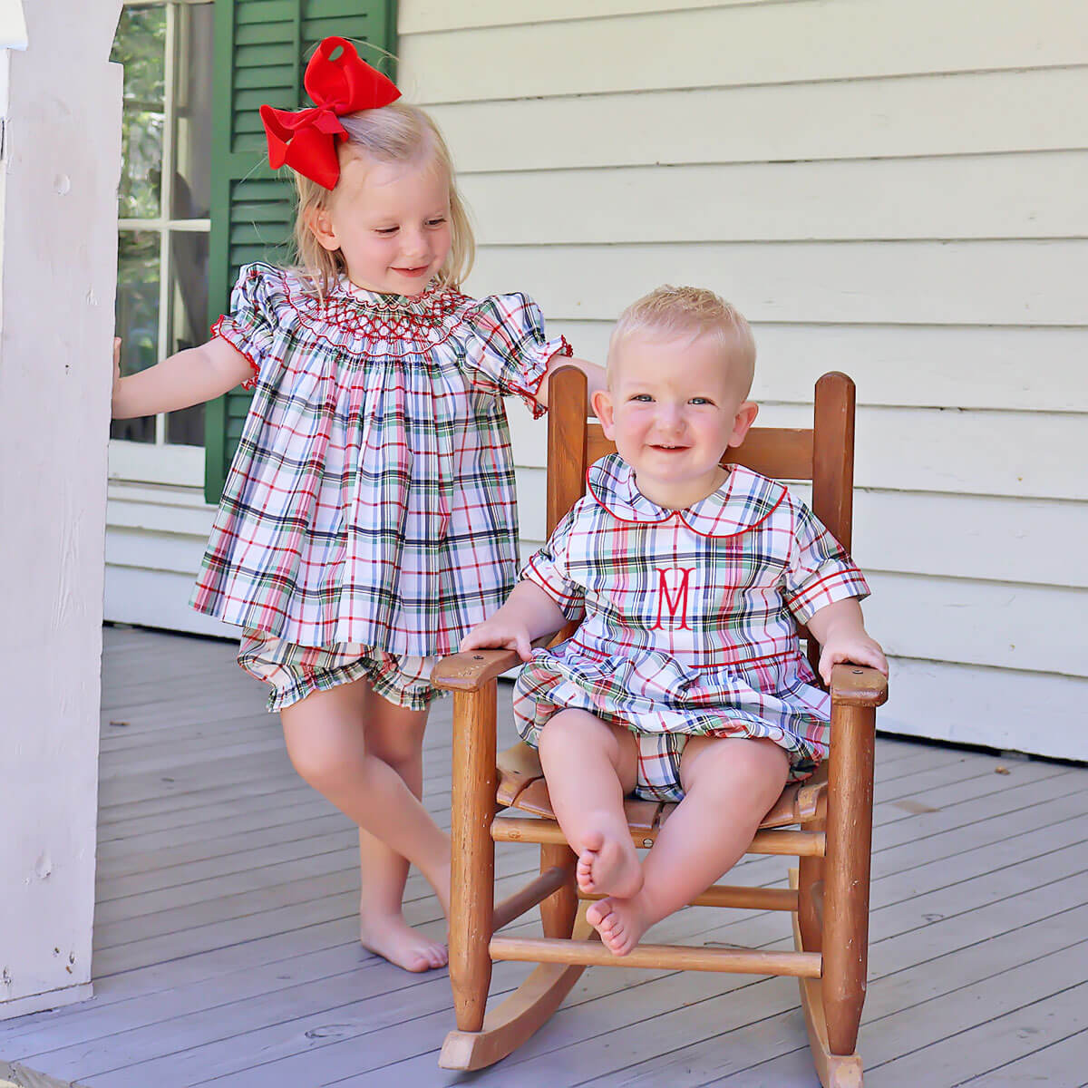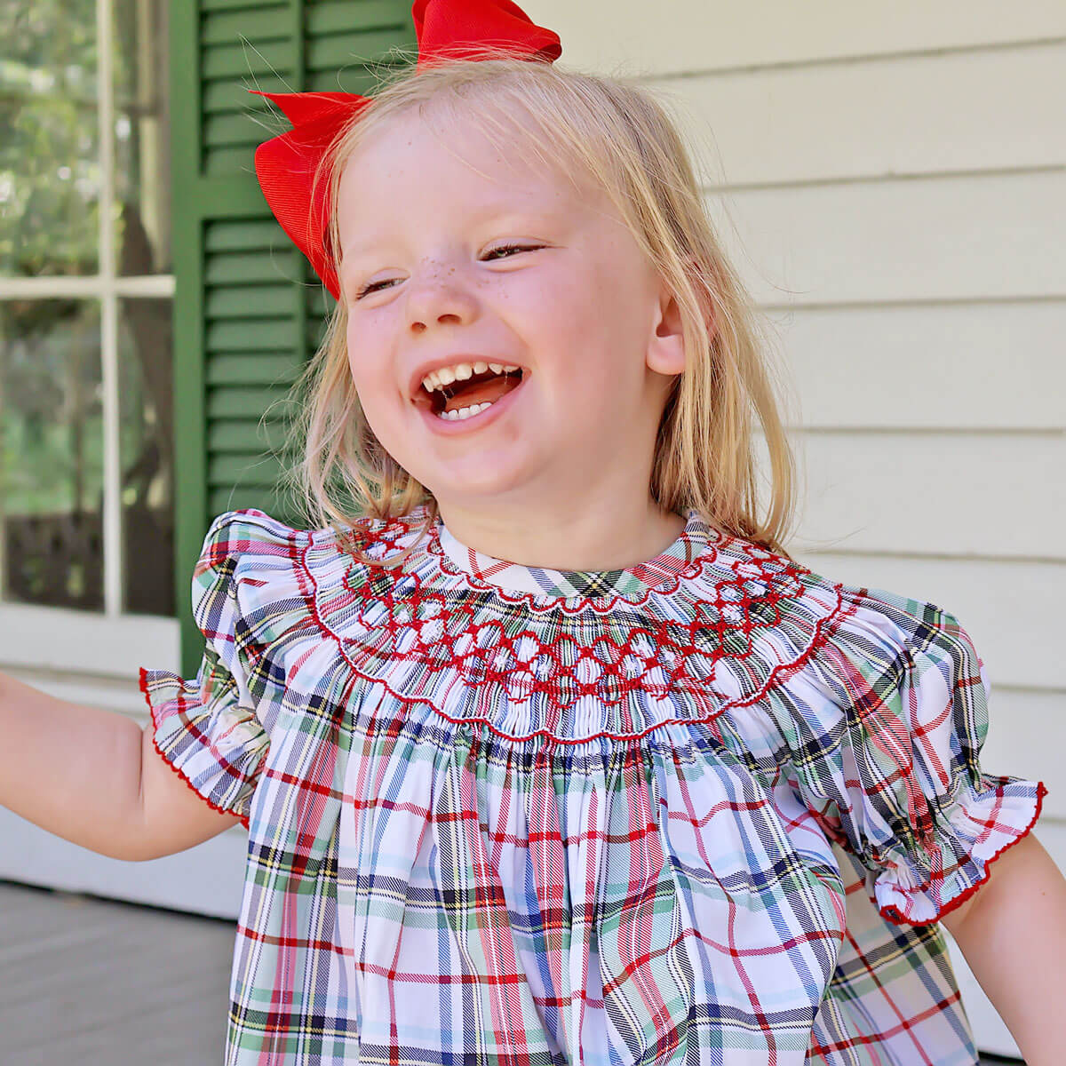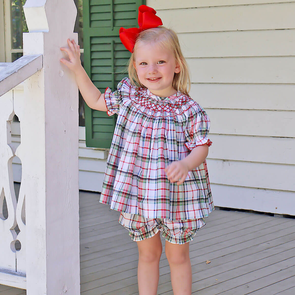 Get your little one ready to celebrate the holidays in our festive Douglas Plaid Smocked Bishop Bloomer Set! This charming plaid top features playful geometric smocking and bishop sleeves adorned with red picot trim, coordinated with matching plaid bloomers. It's the perfect outfit for making holiday memories!
