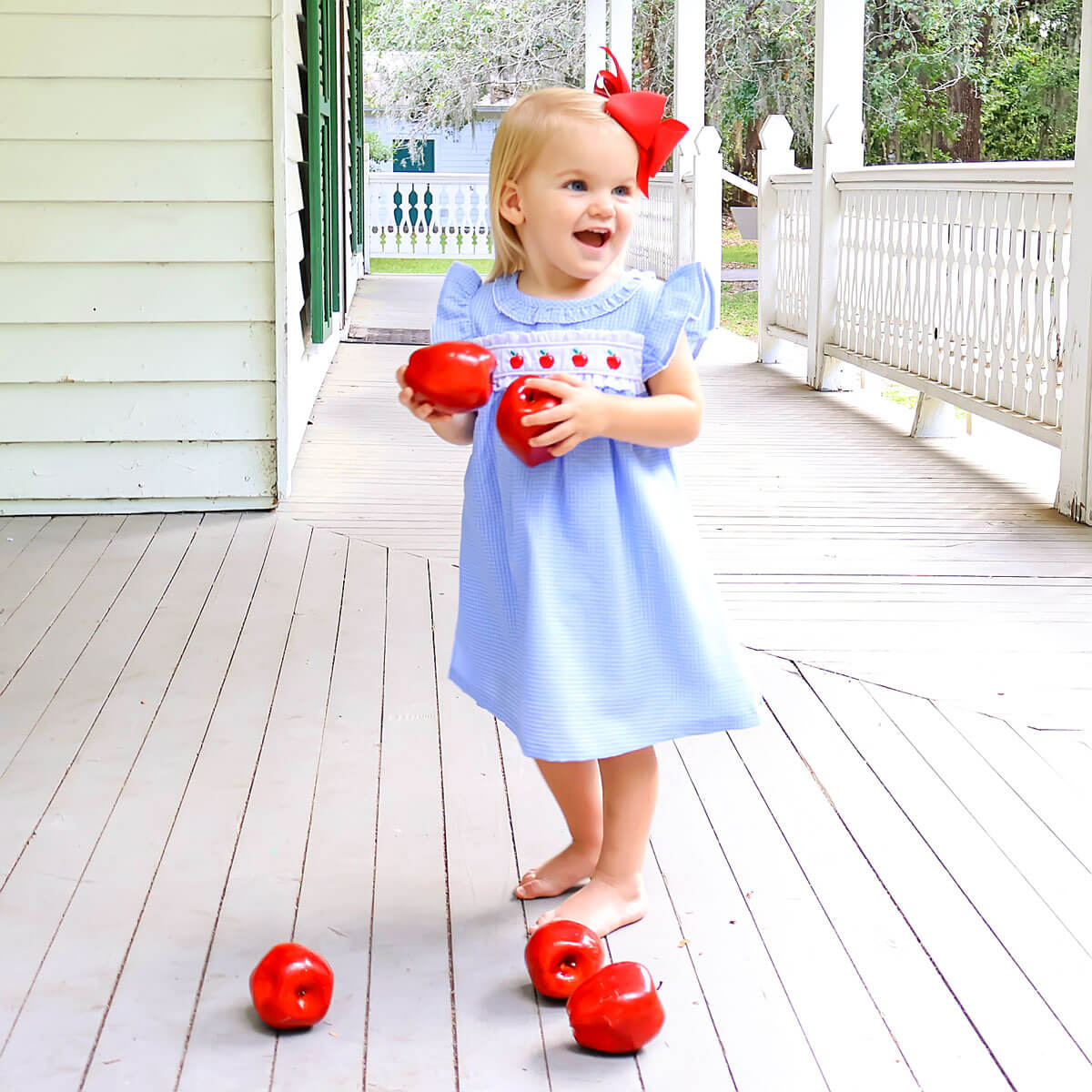 This Apple Blue Windowpane Ruffle Collared Dress is the perfect outfit for the first day of school! With flutter sleeves and a ruffle collar with white picot trim, it's both charming and stylish. And how adorable are those embroidered mini apples! This A+ outfit is a must-have!