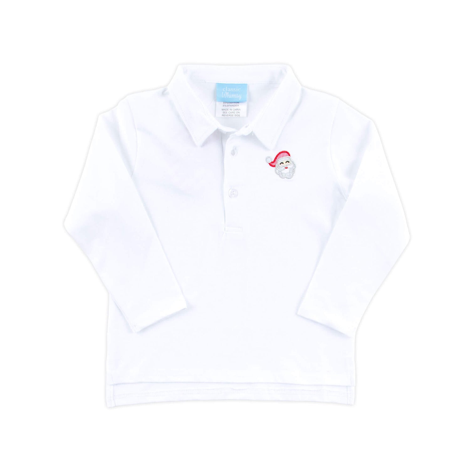 This Happy Santa White Long Sleeve Polo is perfect for pictures with Santa or unwrapping Christmas presents! The white polo features a charming Santa applique on the side. It's ideal for school days, holiday parties, playtime fun, comfort, and cuteness! Don’t forget to add a monogram for a personalized touch!