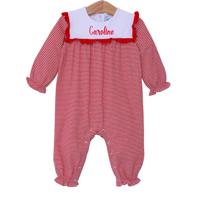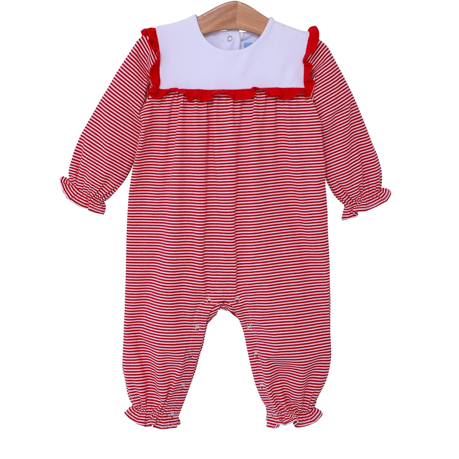 How sweet is the Marie Red Stripe Knit Romper? It's perfect for playtime fun! This red striped romper features long bishop sleeves and a charming white ruffle bib. Snaps in stride for easy changes. Add a monogram to personalize this adorable outfit and make it uniquely hers.