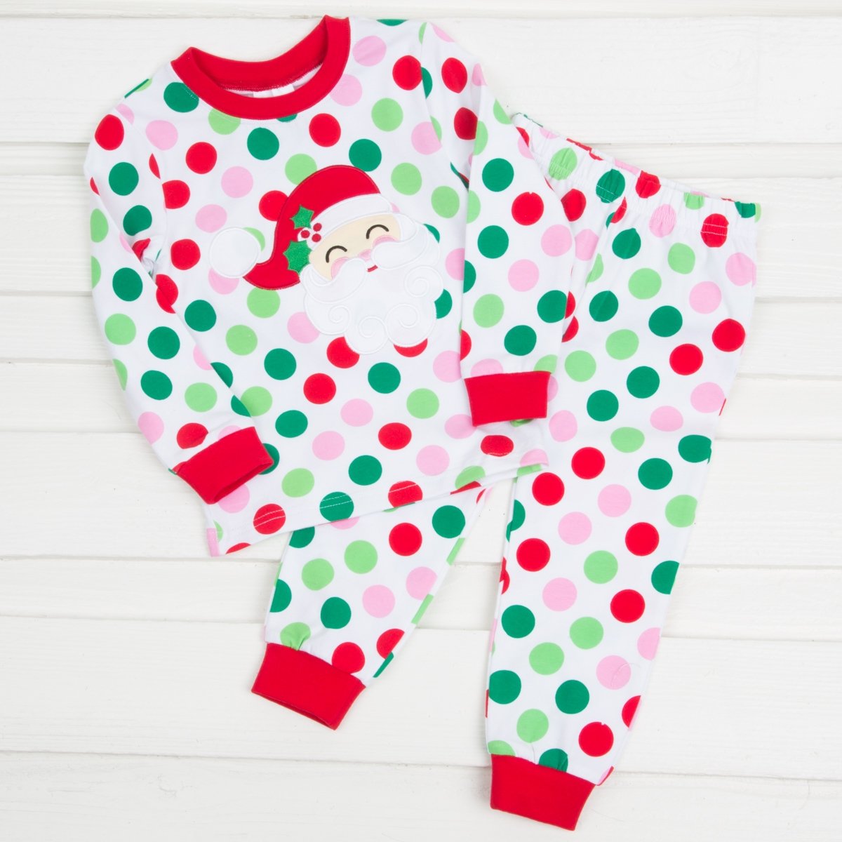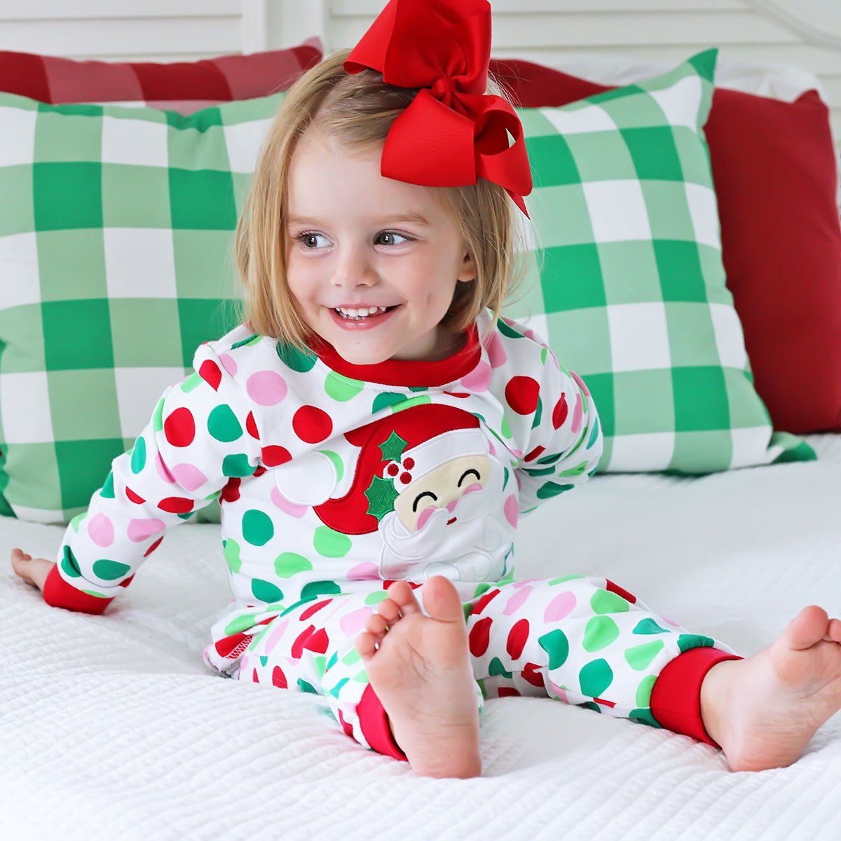 Make bedtime festive with our Happy Santa Multi Polka Dot Pajamas! This adorable set features a sweet Santa appliqué and vibrant polka dots in pink, red, lime green, and kelly green, all accented with red trim. These comfy pajamas are perfect for keeping the holiday spirit alive all Christmas season!