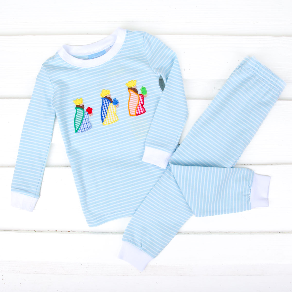 Get your little one ready for holiday bedtime in the cutest Three Kings Nativity Light Blue Stripe Pajamas! These soft, snuggle-ready pajamas feature sweet Three Kings appliques on the long sleeve top, paired with matching bottoms trimmed in white ribbing. Perfect for cozying up by the Christmas tree, these PJs can be personalized with a monogram for an extra special holiday touch.