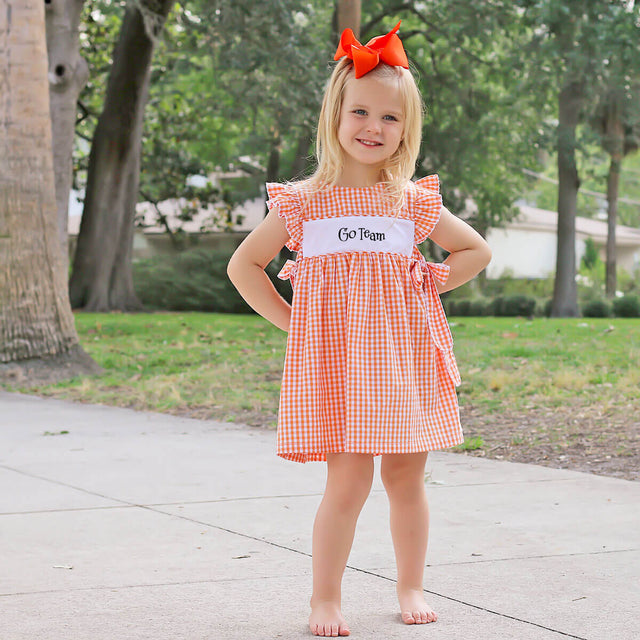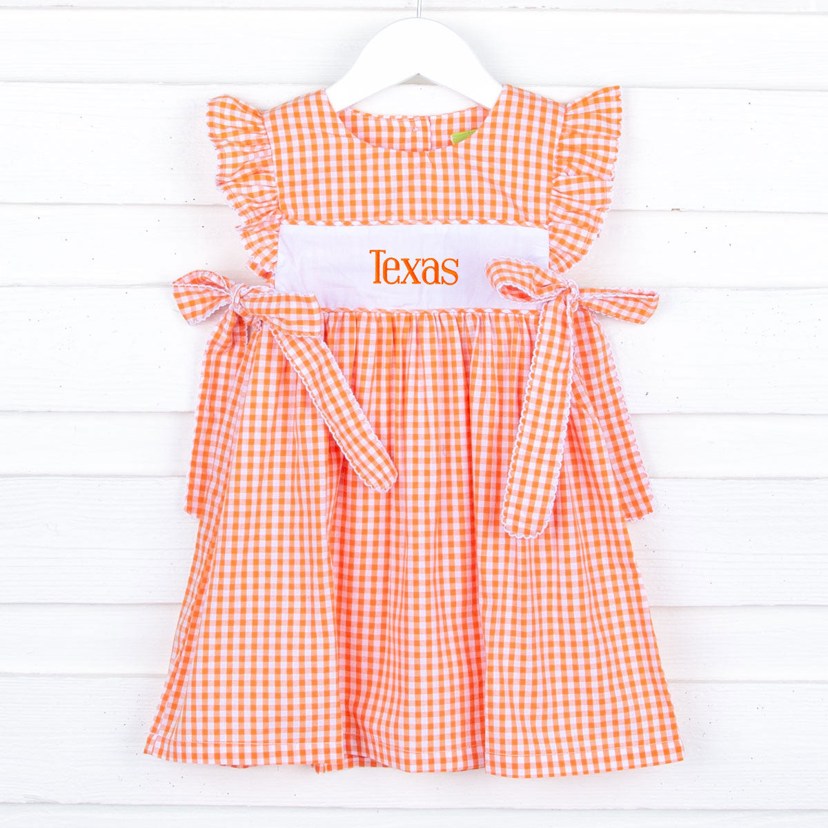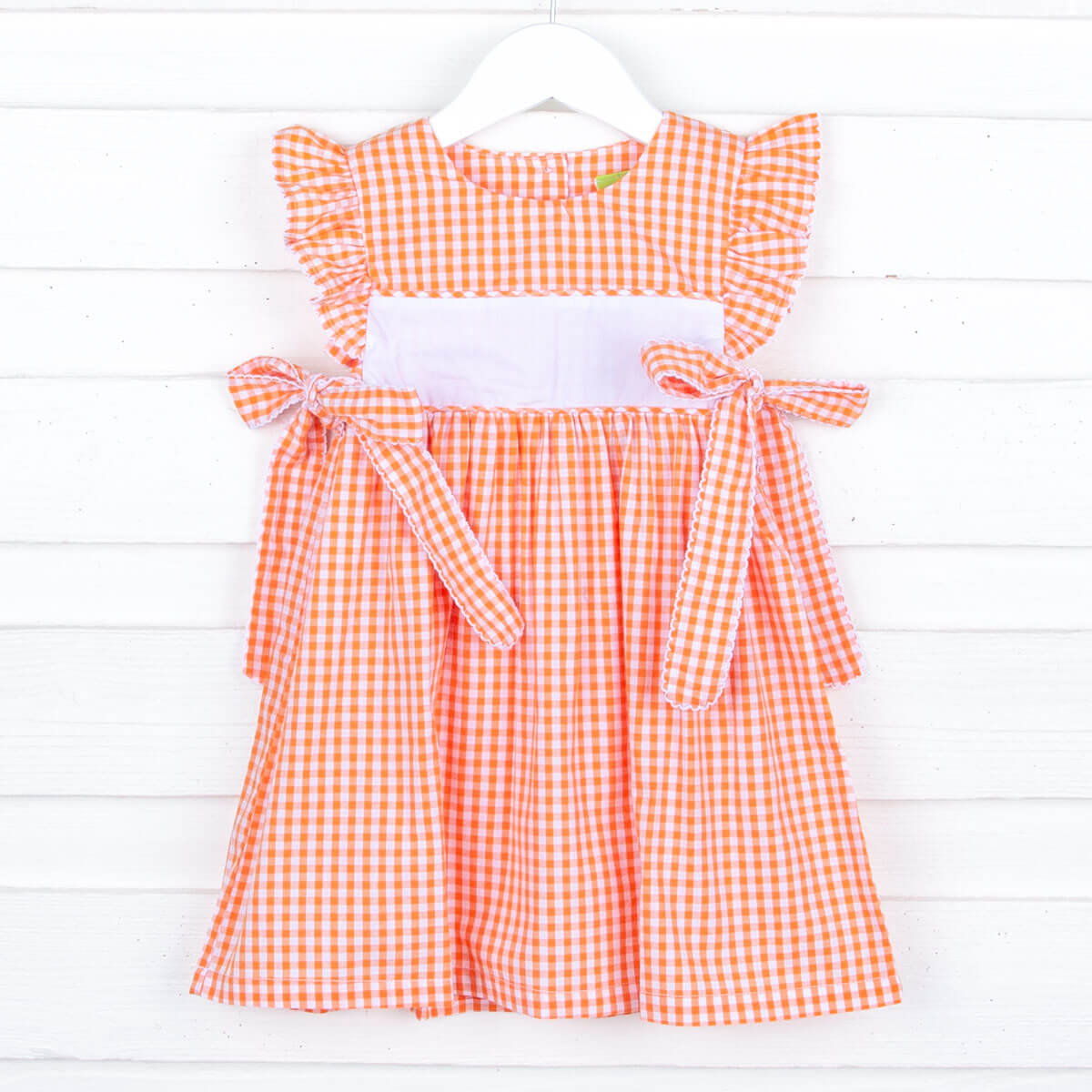 Show your team spirit by wearing this Orange Gingham Avery Dress. Features flutter sleeves and side-tie bows on a brilliant orange gingham. Back buttons for closure. Personalize the look by adding a monogram!