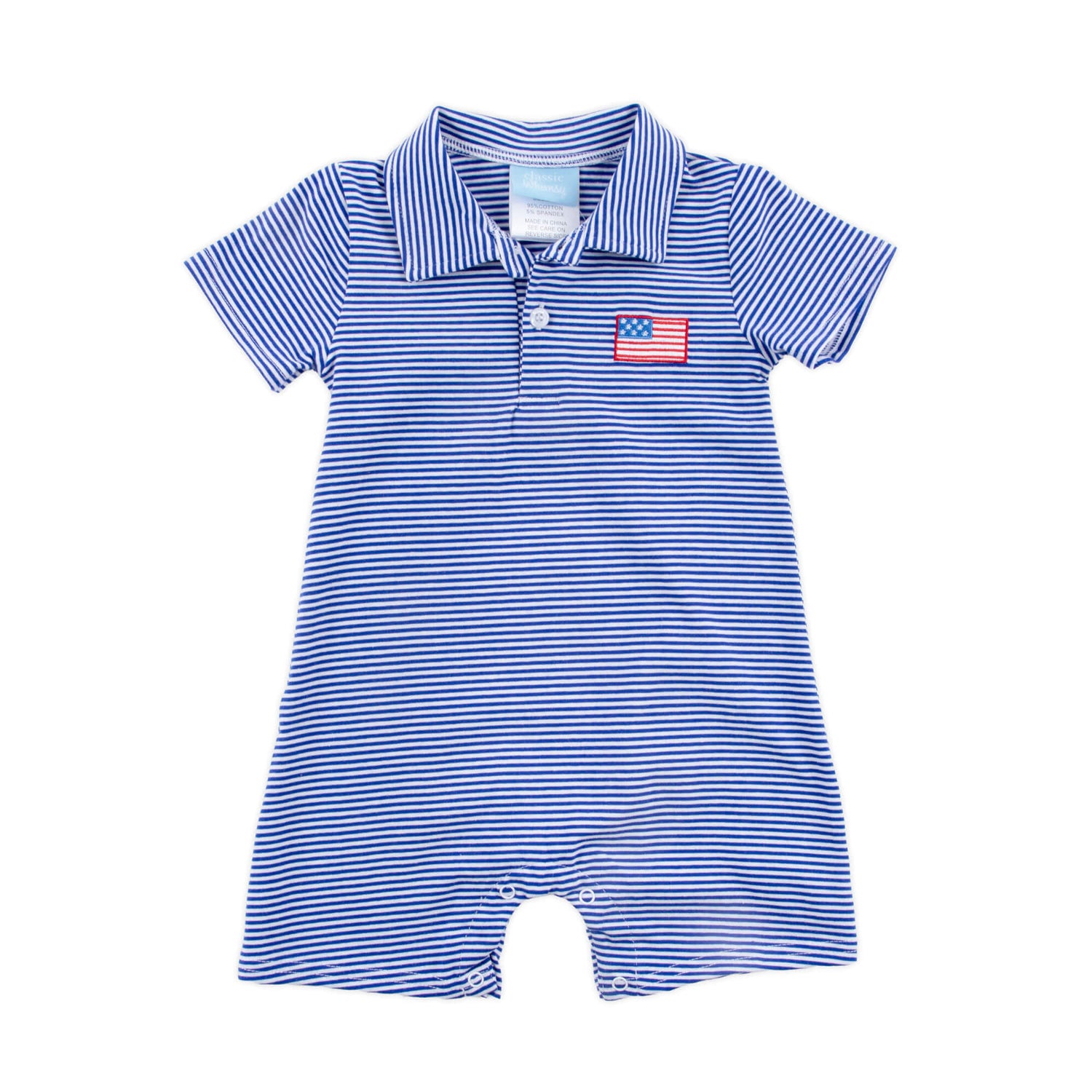Add this Patriotic Spirit Blue Stripe Polo Romper to your little boy’s patriotic wardrobe for a versatile and stylish staple. This short-sleeve romper features a classic design with an embroidered flag for a timeless look. It’s the perfect outfit to celebrate patriotic style at any festive event.