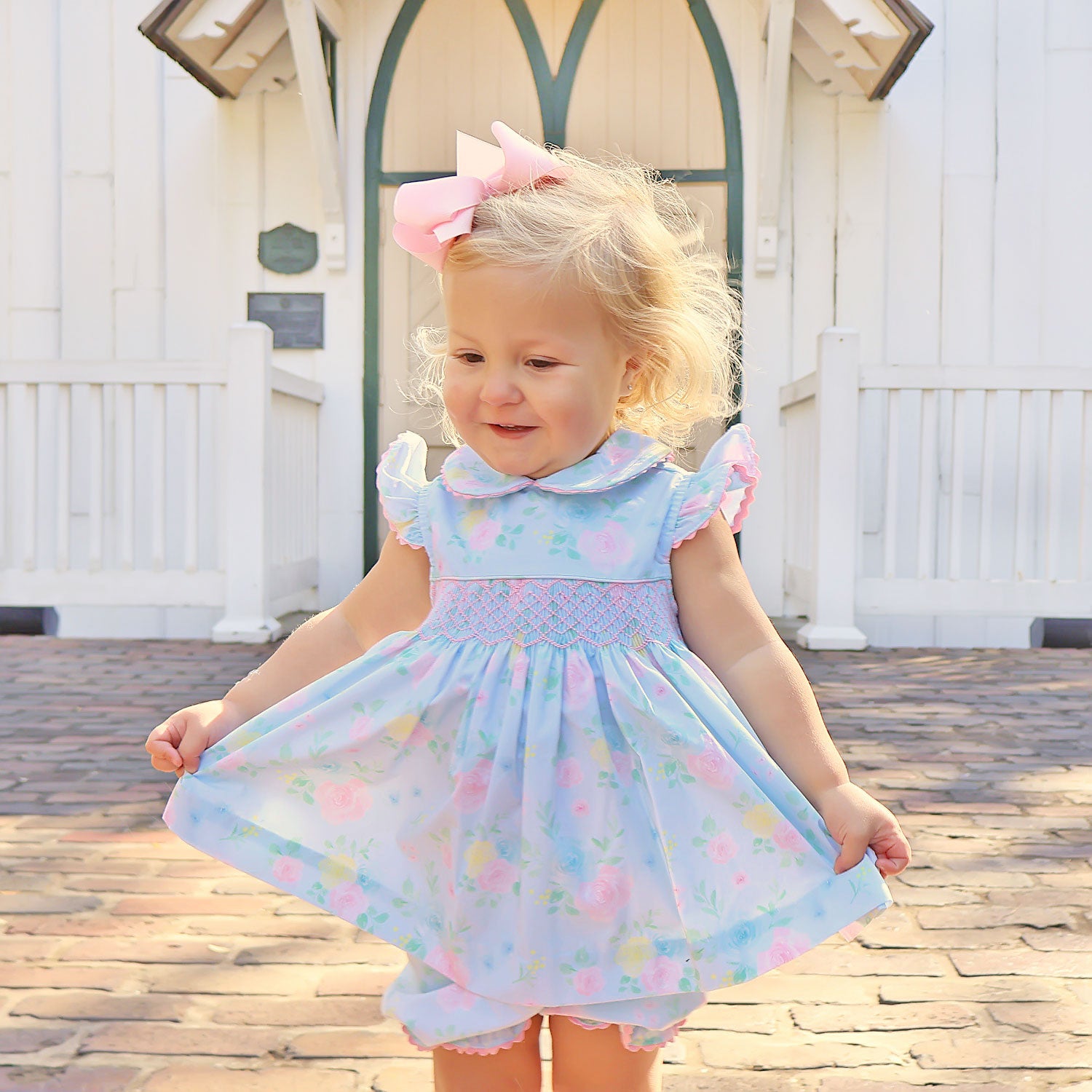 Celebrate Easter and springtime in the most charming way with our Peony Floral Geo Smocked Collared Bloomer Set. This darling top features a pink peony print, perfect for any spring celebration. With a sweet collared neckline, delicate geometric smocking, and flutter sleeves, it adds a touch of girly sweetness. The set is paired with matching peony print bloomers, making it a coordinated and cute look. Ideal for twirling at family gatherings or Easter adventures, this bloomer set is sure to bring charm and grace to your little one's special moments!