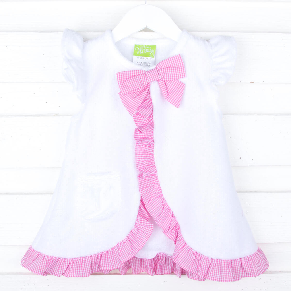 This Pink Check Swim Cover-Up is an adorable addition to any girl's swimwear collection! Made from white terry fabric with charming pink check ruffle trim, it exudes cuteness. The front bow adds an extra touch of charm, making it the perfect beach accessory for your little swimmer. Add a monogram for a personalized touch.