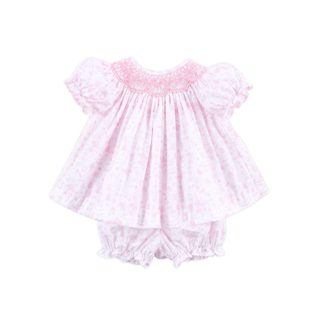 Get ready to celebrate the holidays in style with our Pink Christmas Print Smocked Bloomer Set. This delightful set is adorned with a charming and festive pink Christmas print. The top features hand-smocking and bishop sleeves with pink picot trim, making it a perfect choice for the season!