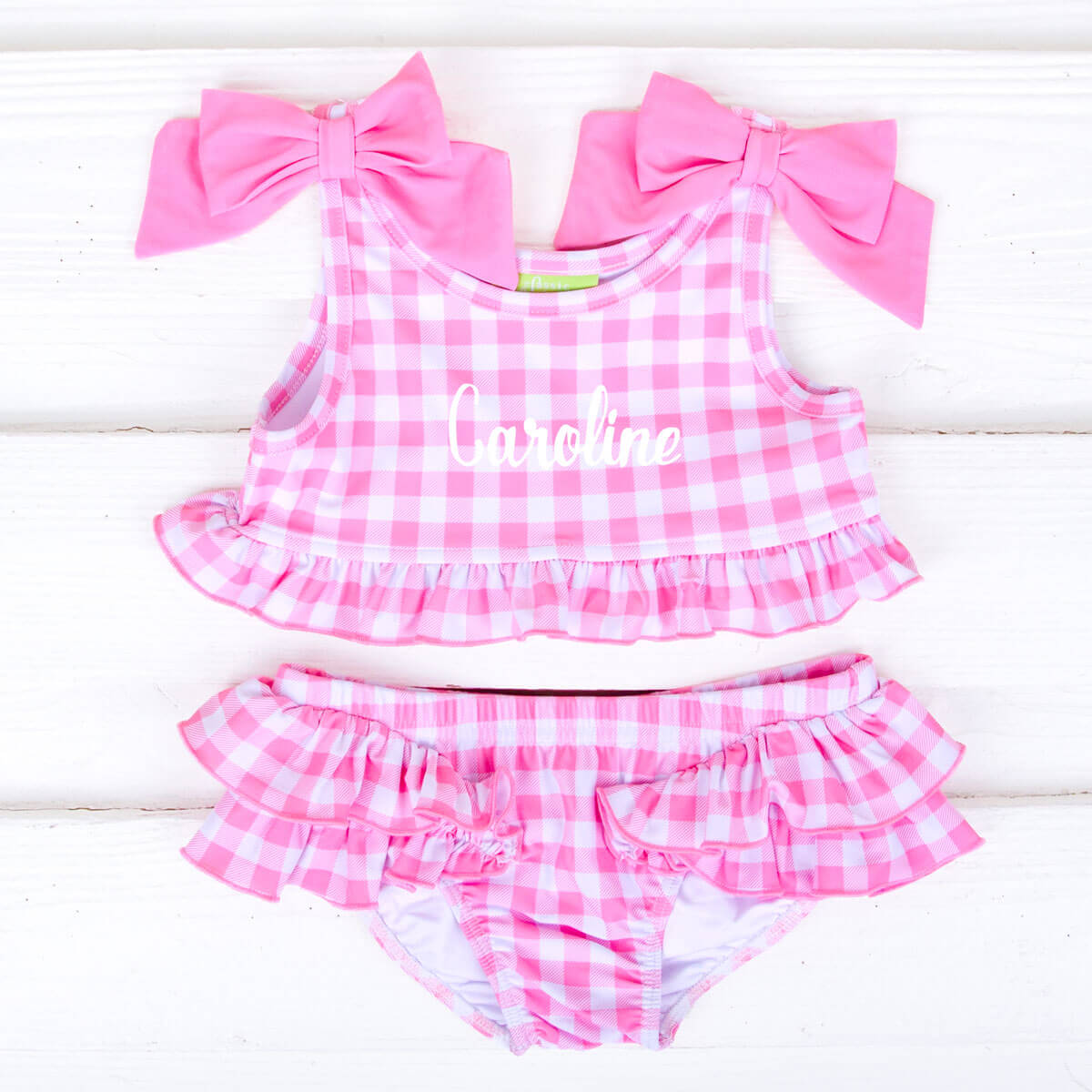 This Capri Pink Two Piece Swimsuit is the perfect choice for your upcoming family vacation or poolside gathering. The crop swim top features a fabulous pink gingham print, ruffle hem, and two adorable pink bows. Accompanied by a matching ruffle swim bottom, this set ensures both style and comfort. The swimsuit provides UPF 50 Protection to keep your little one safe under the sun. Personalize the look by adding a monogram to make it uniquely yours!