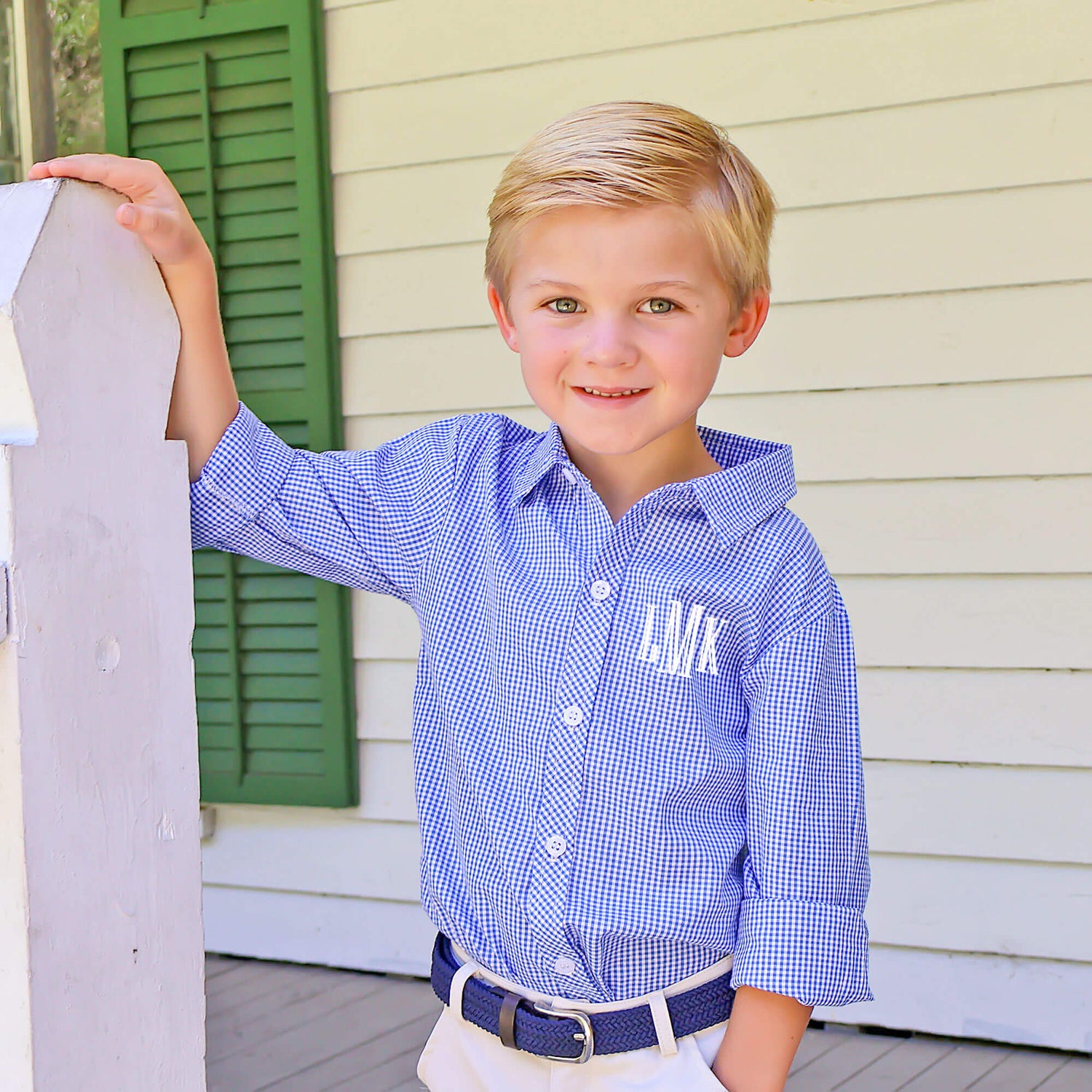 Elevate your little one's wardrobe with our Royal Blue Gingham Button Down Shirt, the perfect addition for the season. This shirt is both stylish and versatile. Ideal for outings to the pumpkin patch, Thanksgiving gatherings, Christmas, Easter celebrations, or any special occasion, this shirt is sure to make your little one stand out. Personalize it with a monogram to make it even more special and unique!
