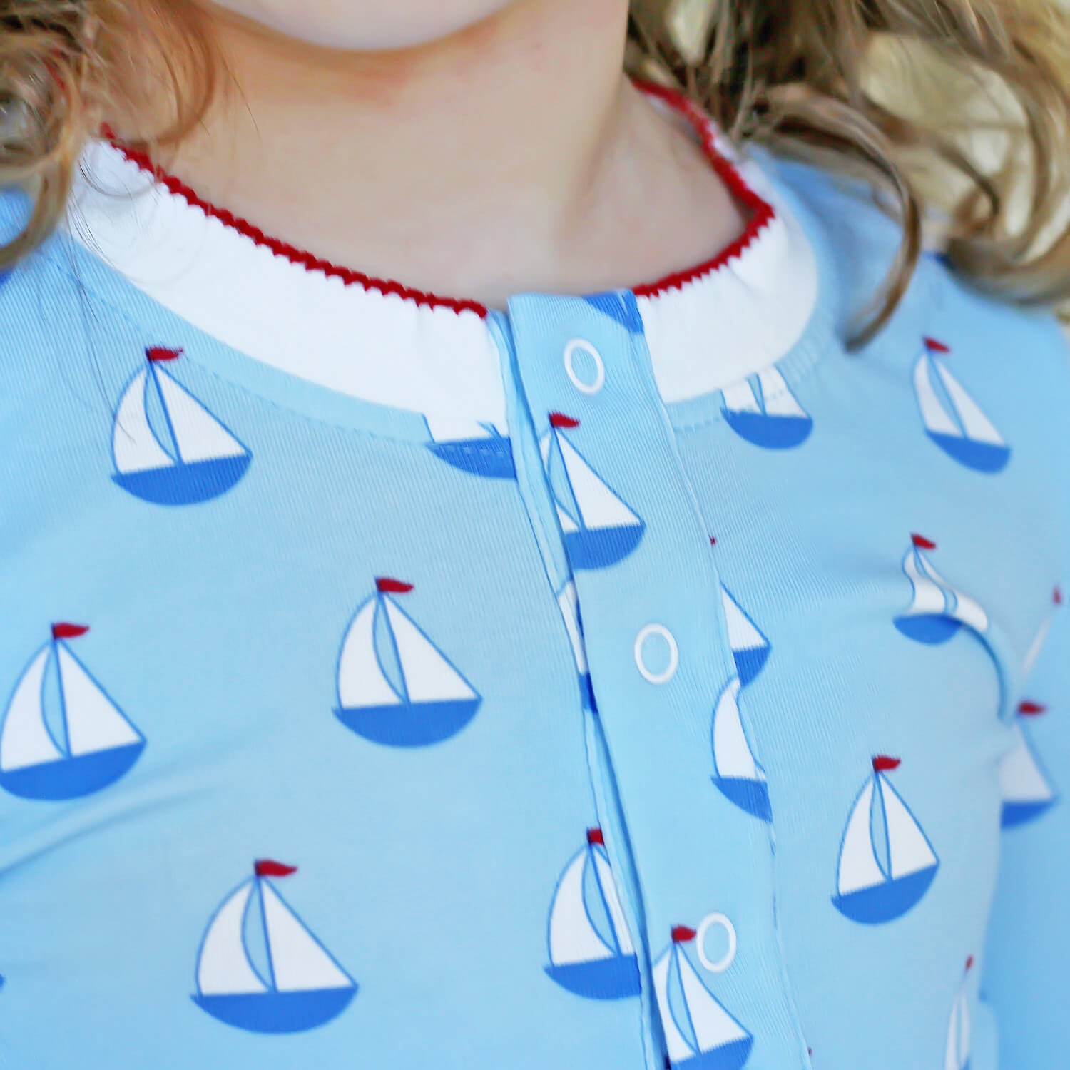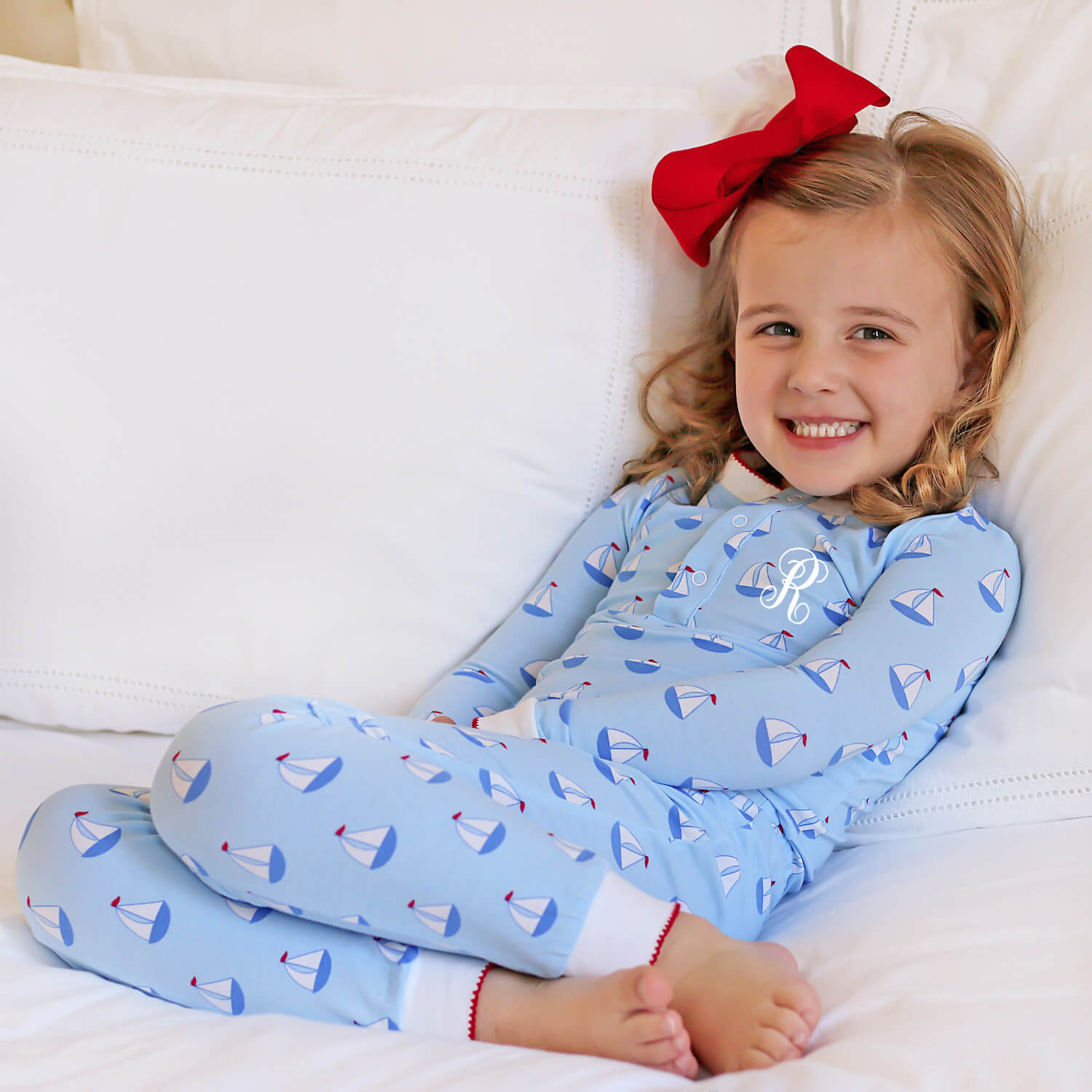 Your little one will enjoy cozy and comfortable nights in our Sailboat Print Henley Pajamas. These charming pajamas feature a playful blue sailboat print and white trim, making them a fun and stylish choice for your little one's bedtime attire. The set includes a long-sleeve pajama top and matching pull-on pajama pants, providing the perfect combination of comfort and warmth. Personalize these pajamas with a monogram for an adorable and unique touch!