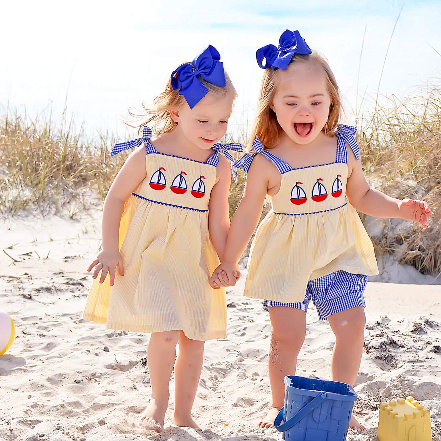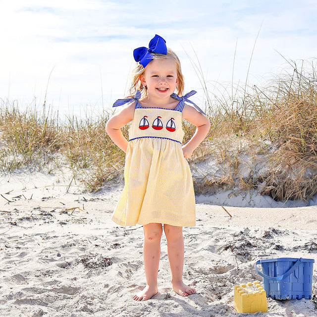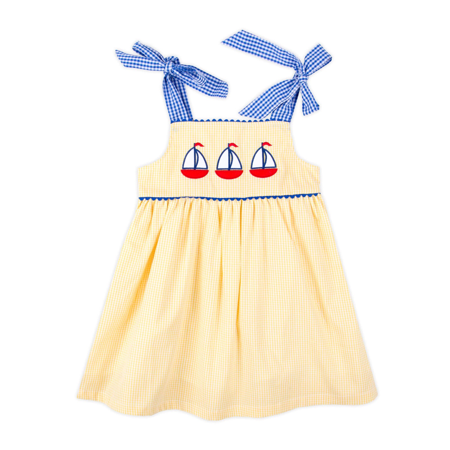 Your little one will be ready to sail into summer style in the Newport Sailboat Yellow Gingham Aubree Dress! This cheerful yellow gingham dress features three adorable sailboat appliqués, playful blue ric-rac details, and sweet blue gingham tie straps. Perfect for sunny days and seaside adventures!