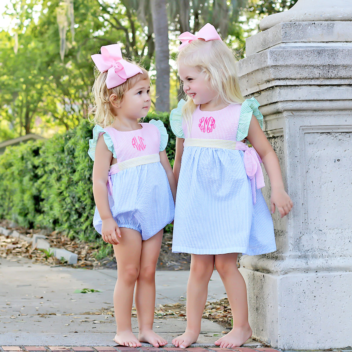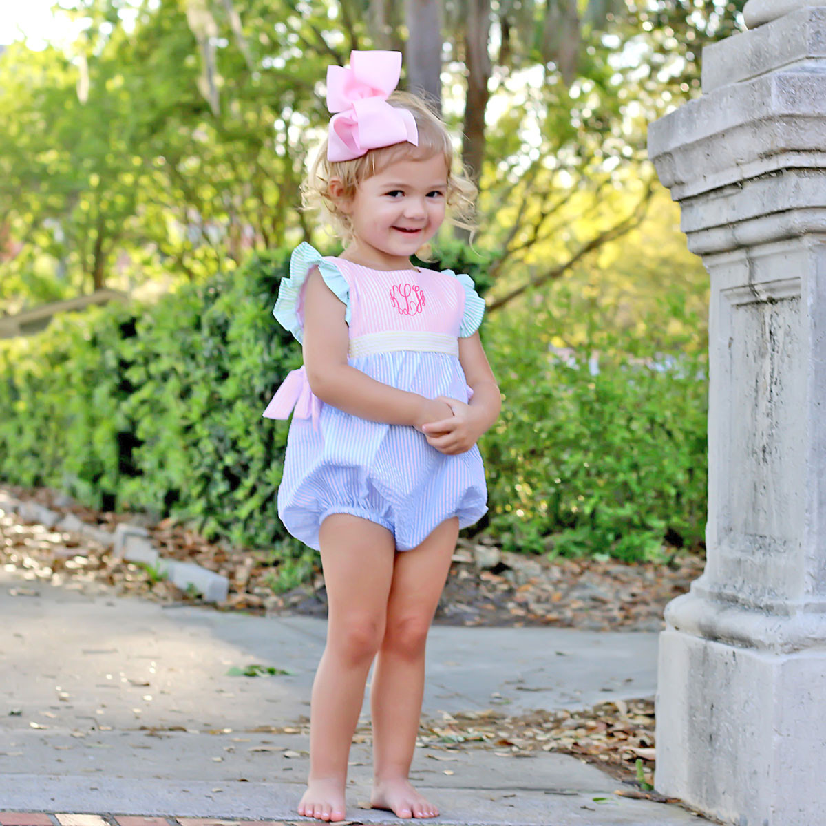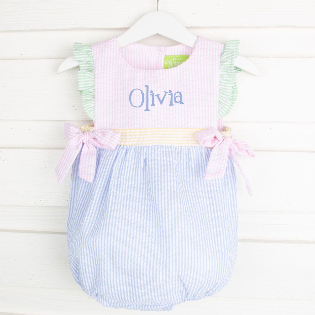 The Multi-Stripe Seersucker Avery Bubble is a delightful and playful outfit! Featuring flutter sleeves and side ties in charming colorblock pastel seersucker fabric, it's perfect for spring, summer, or even a birthday celebration. Convenient snaps in the stride make dressing easy, while a monogram adds the perfect personalized touch!